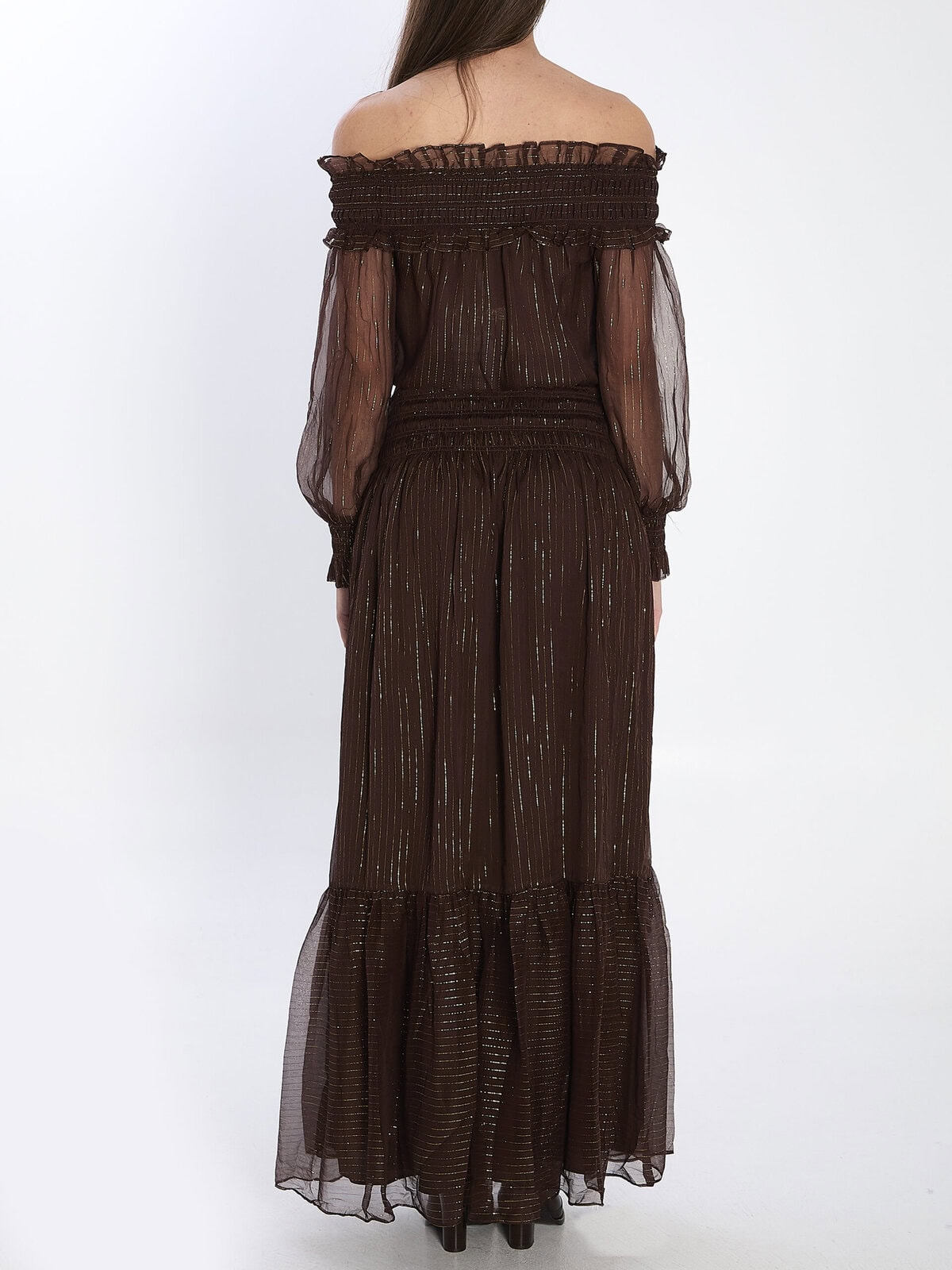 Brown crinkle georgette maxi dress. Features off-shoulder silhouette with ruffles, puff sleeves, elasticated waist with tassel details, flared skirt, metallic accents, and knee-length polyester lining. Regular fit.