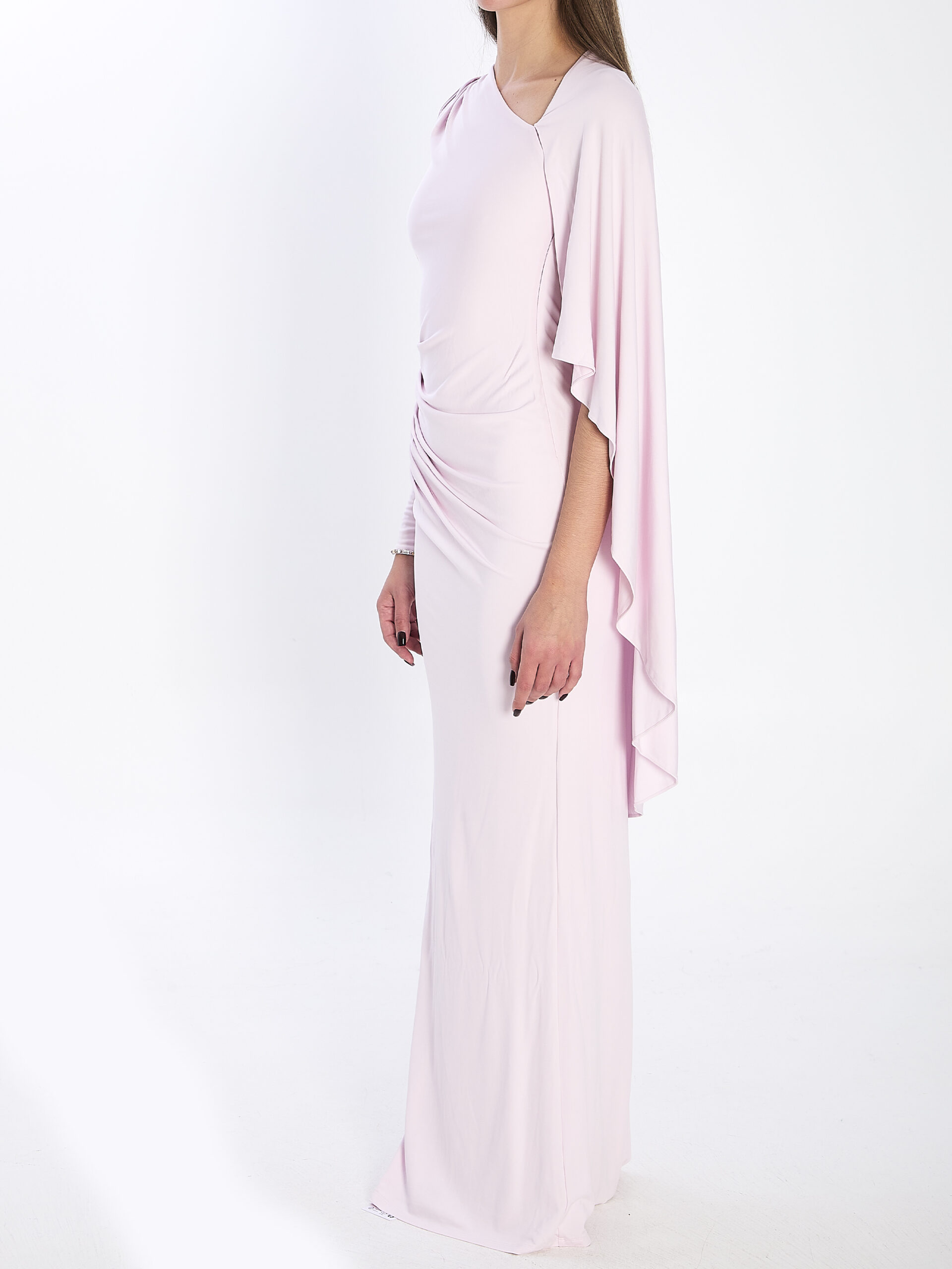 Pink jersey maxi dress. Features asymmetric neckline with cape-effect draping, long sleeve with crystal-embellished cuff and zip closure, side zip closure, mermaid hem, and viscose-blend lining. Regular fit.