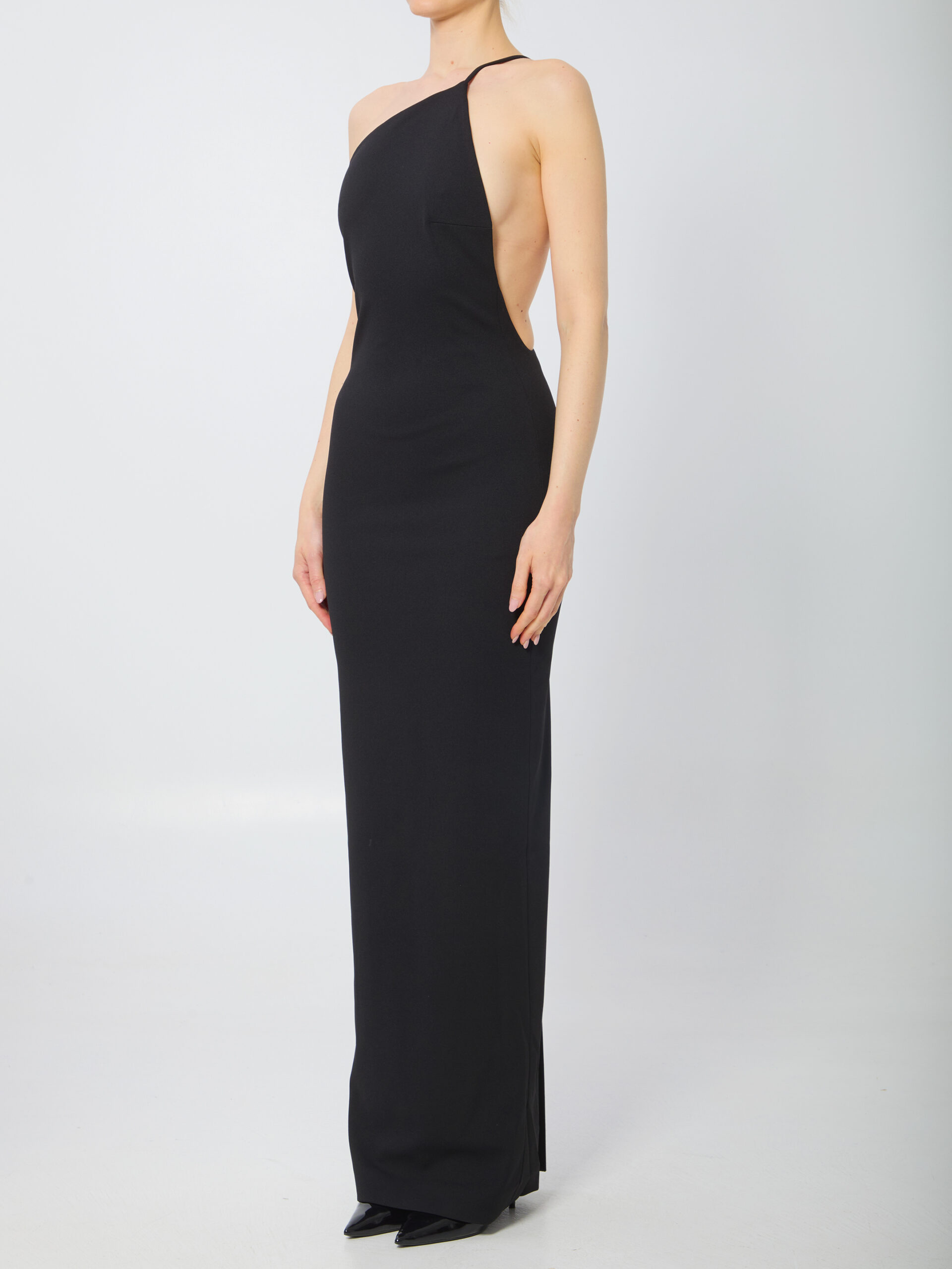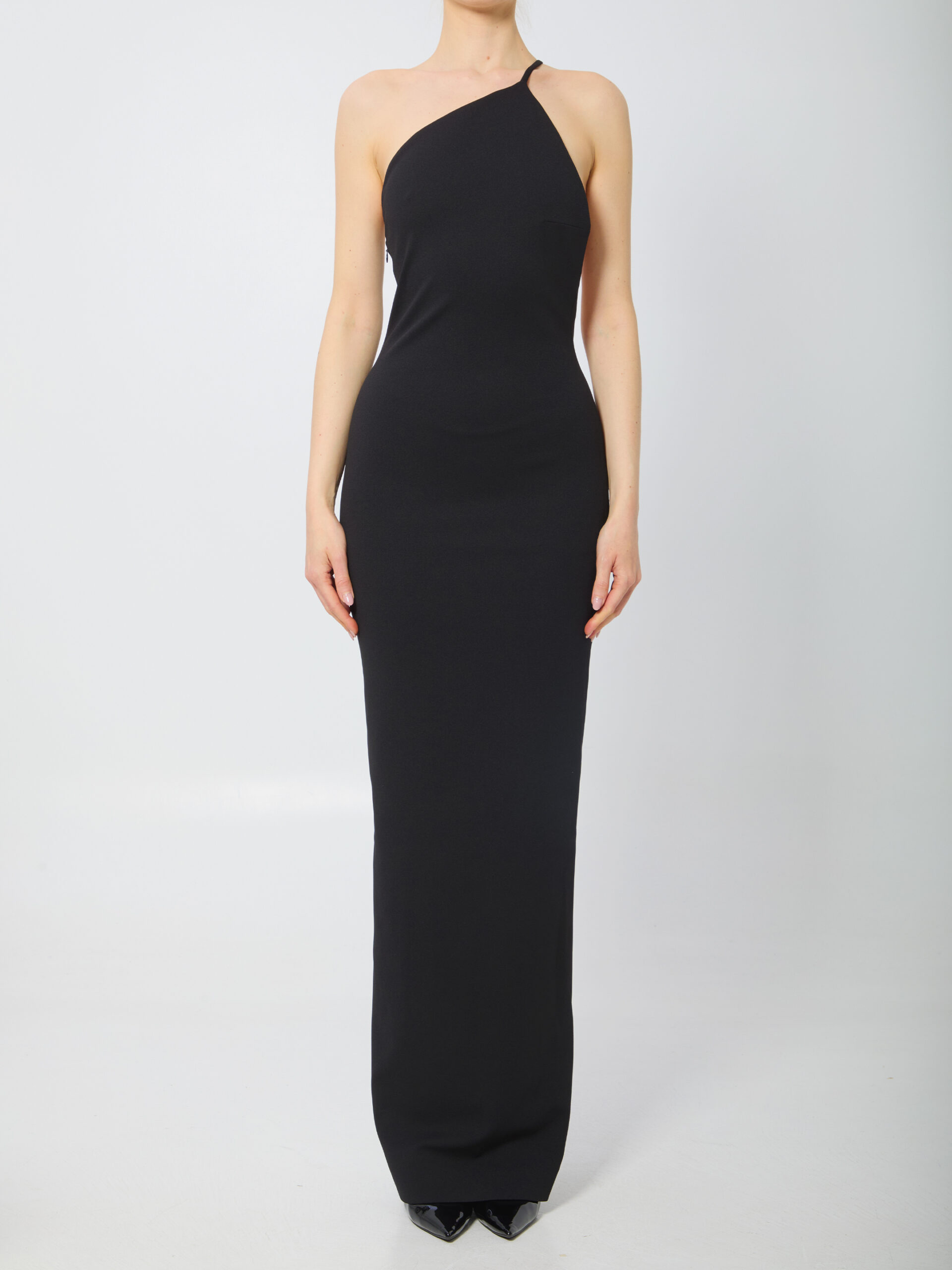 Black stretch polyester crepe one-shoulder maxi dress. It features a thin shoulder strap, side zipper closure, long skirt, center back slit. Slim fit.
