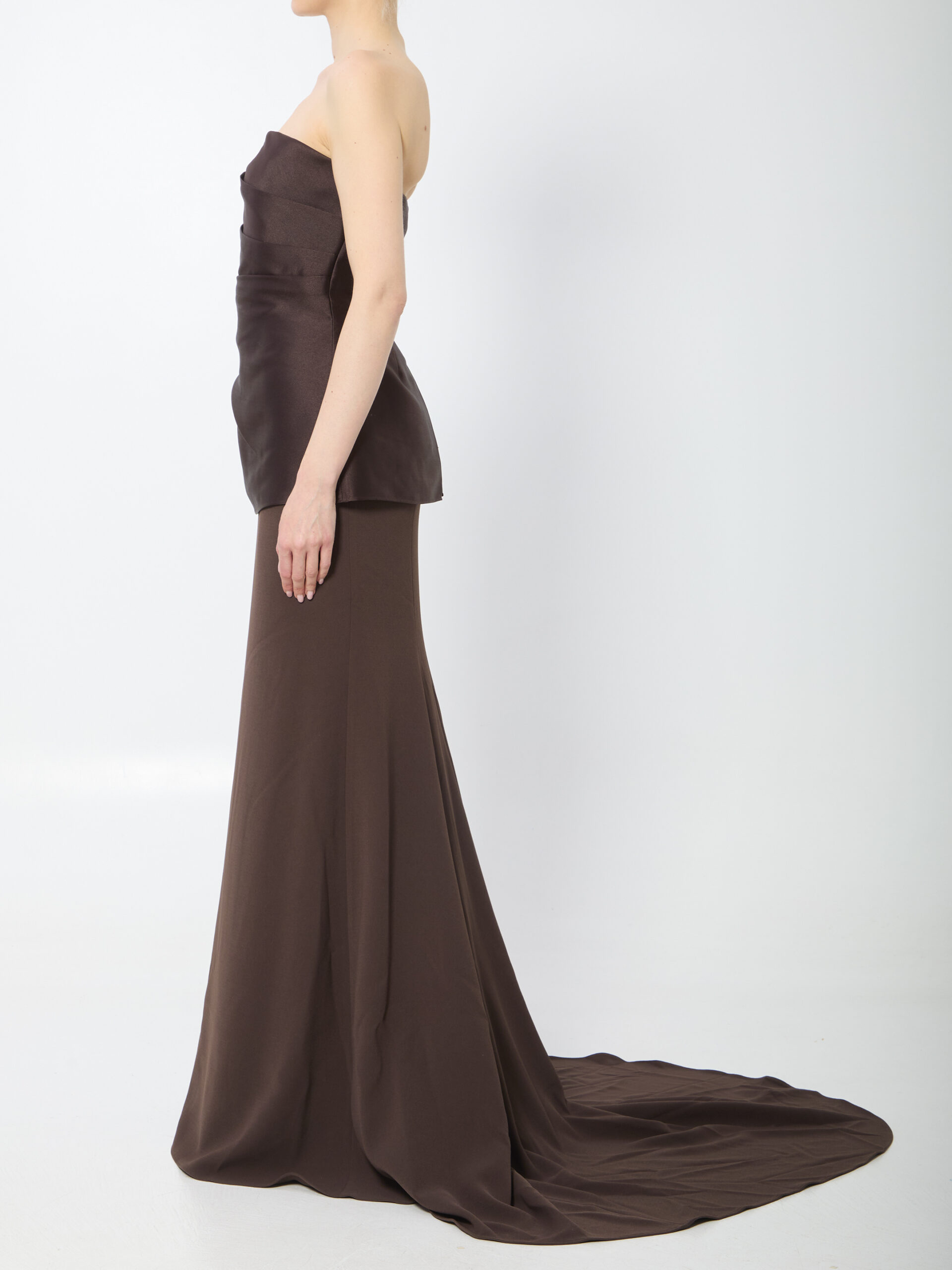 Chestnut brown polyester twill maxi dress. It features a twill draped bodice, back closure with zipper and hook, long skirt with crepe train, stretch polyester lining. Slim fit.