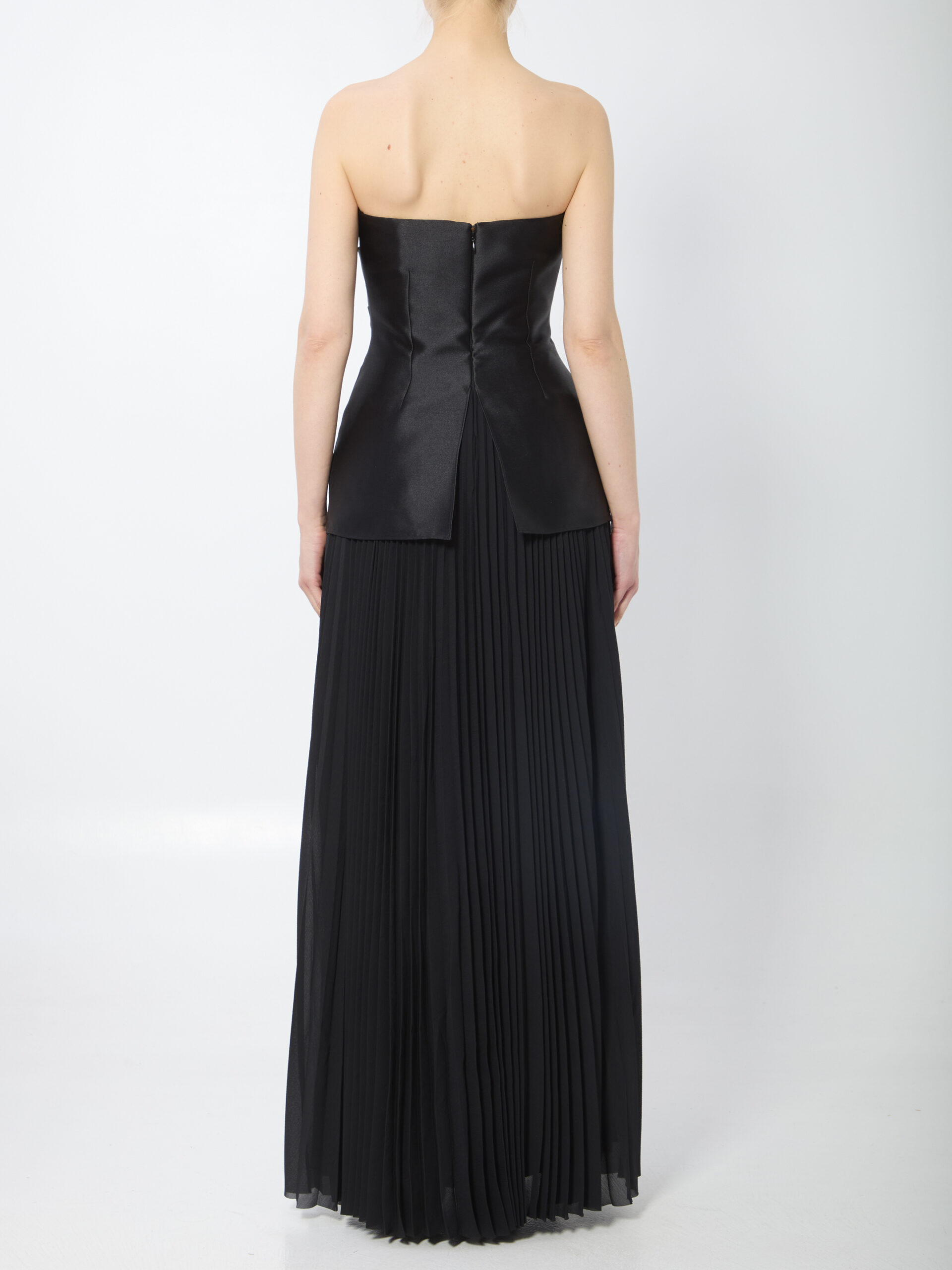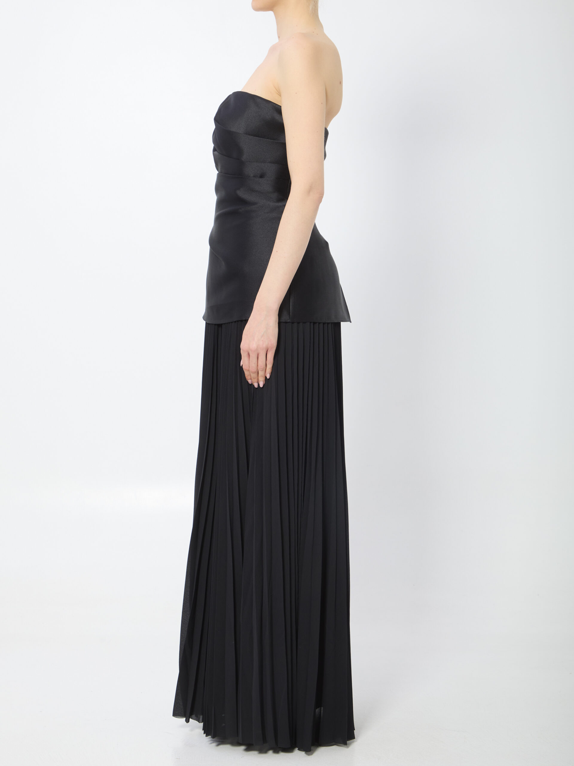 Black polyester twill maxi dress. It features a draped bustier, back zipper closure, long pleated chiffon skirt, stretch polyester lining. Slim fit.