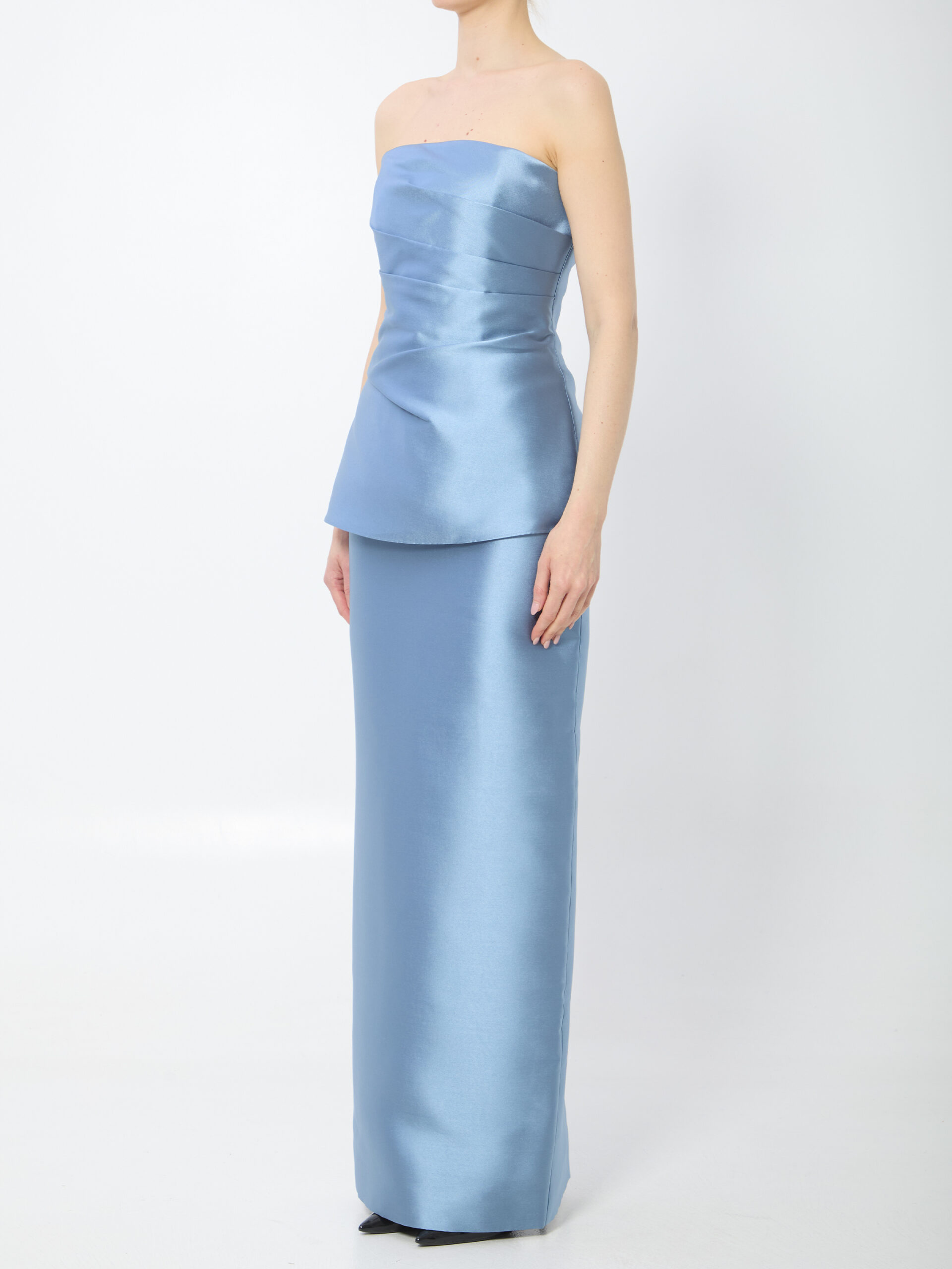 Slate blue polyester twill maxi dress. It features a draped bustier, back zipper closure, straight long skirt with center back slit, stretch polyester lining. Slim fit.