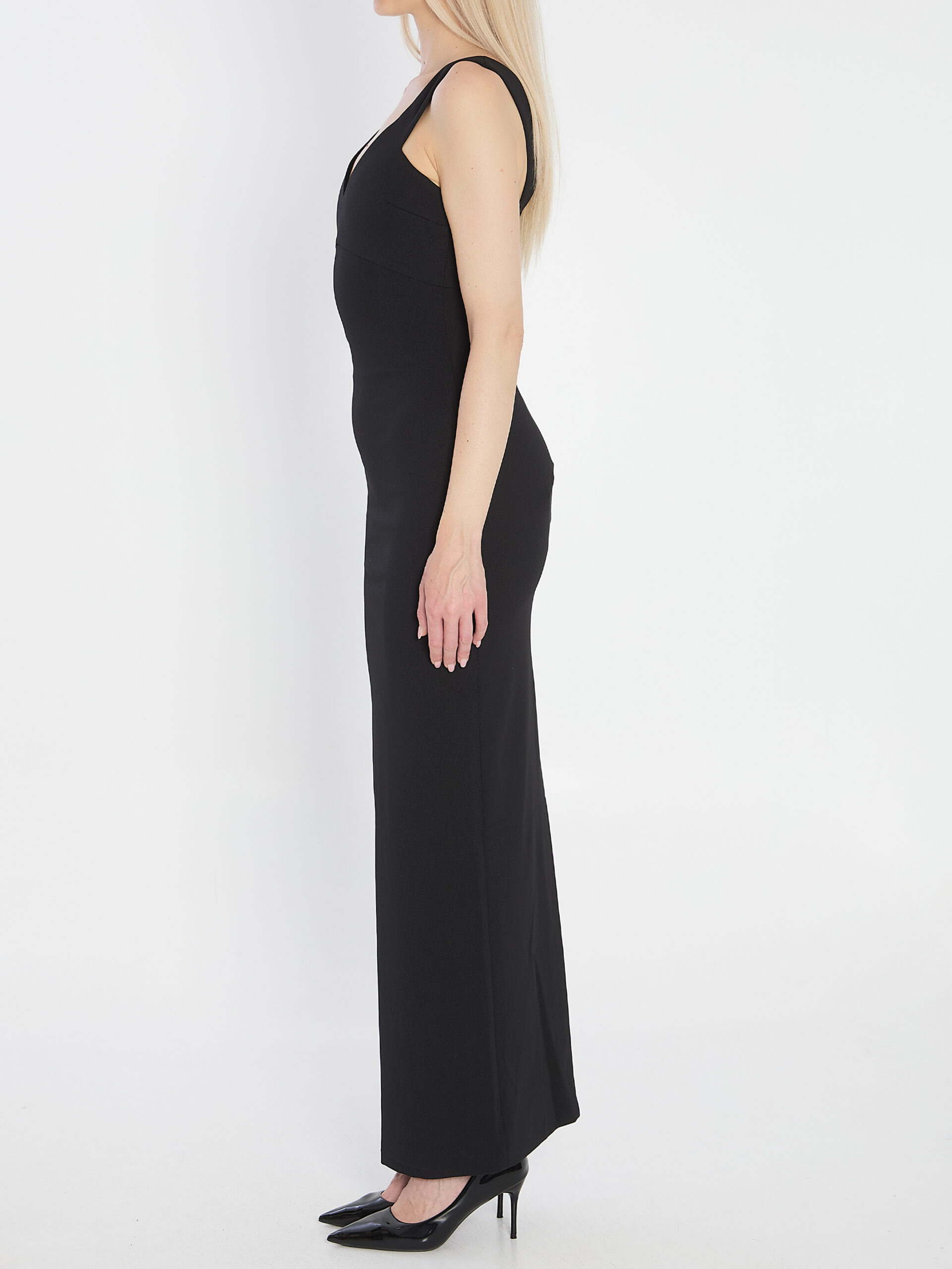 Black maxi dress in polyester. It features a fitted silhouette, V-neckline, off-the-shoulder design with wide straps, semi-open back, central back slit, and a concealed back zip closure.