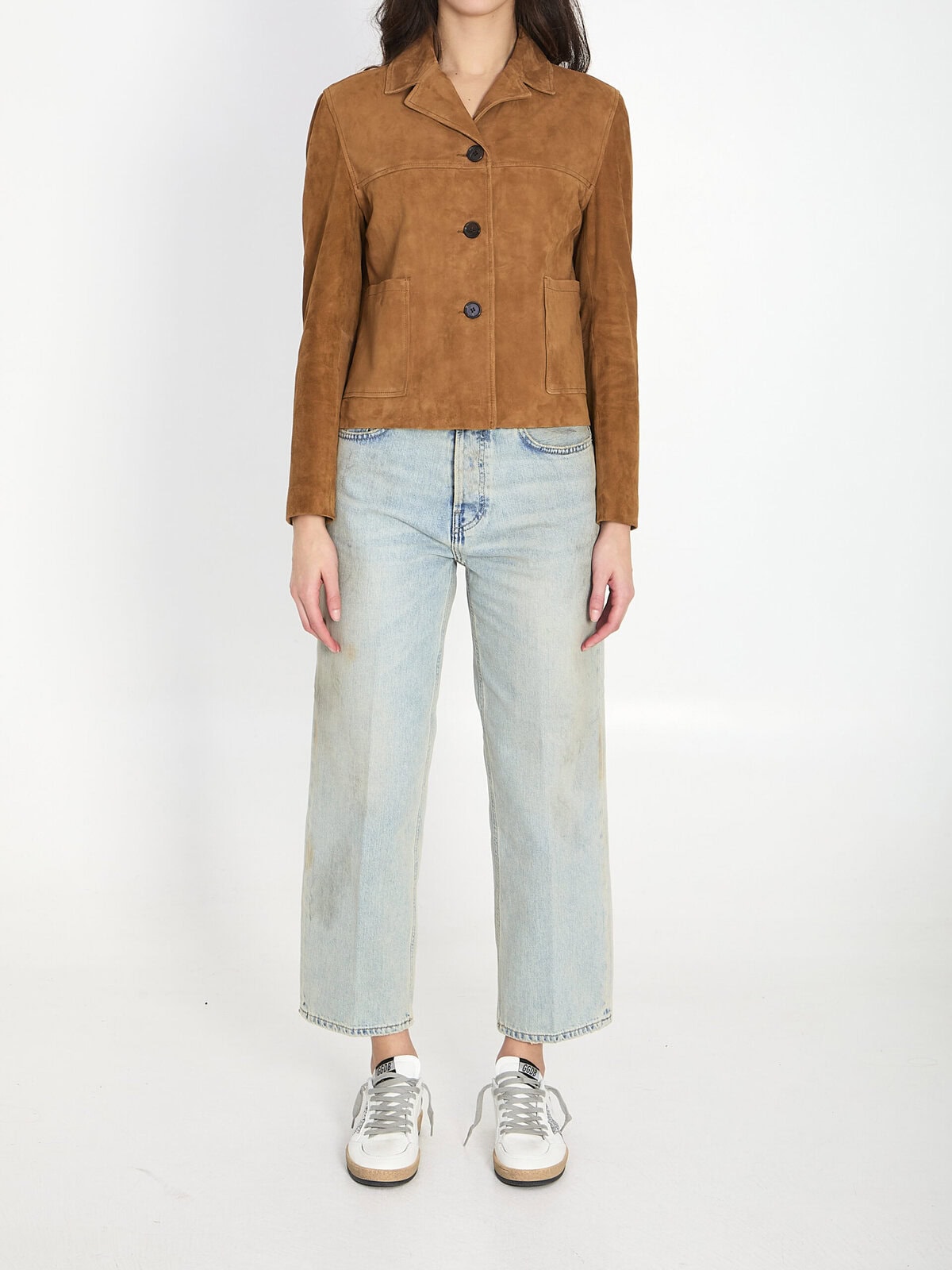 Whiskey brown suede goatskin leather jacket. It features a classic notch lapel, a front button closure, long sleeves, two patch pockets on the front, and a cotton blend lining. Cropped cut. Regular fit. Any irregularities in the leather are not to be considered defects, but distinctive features that highlight the natural quality of the material.