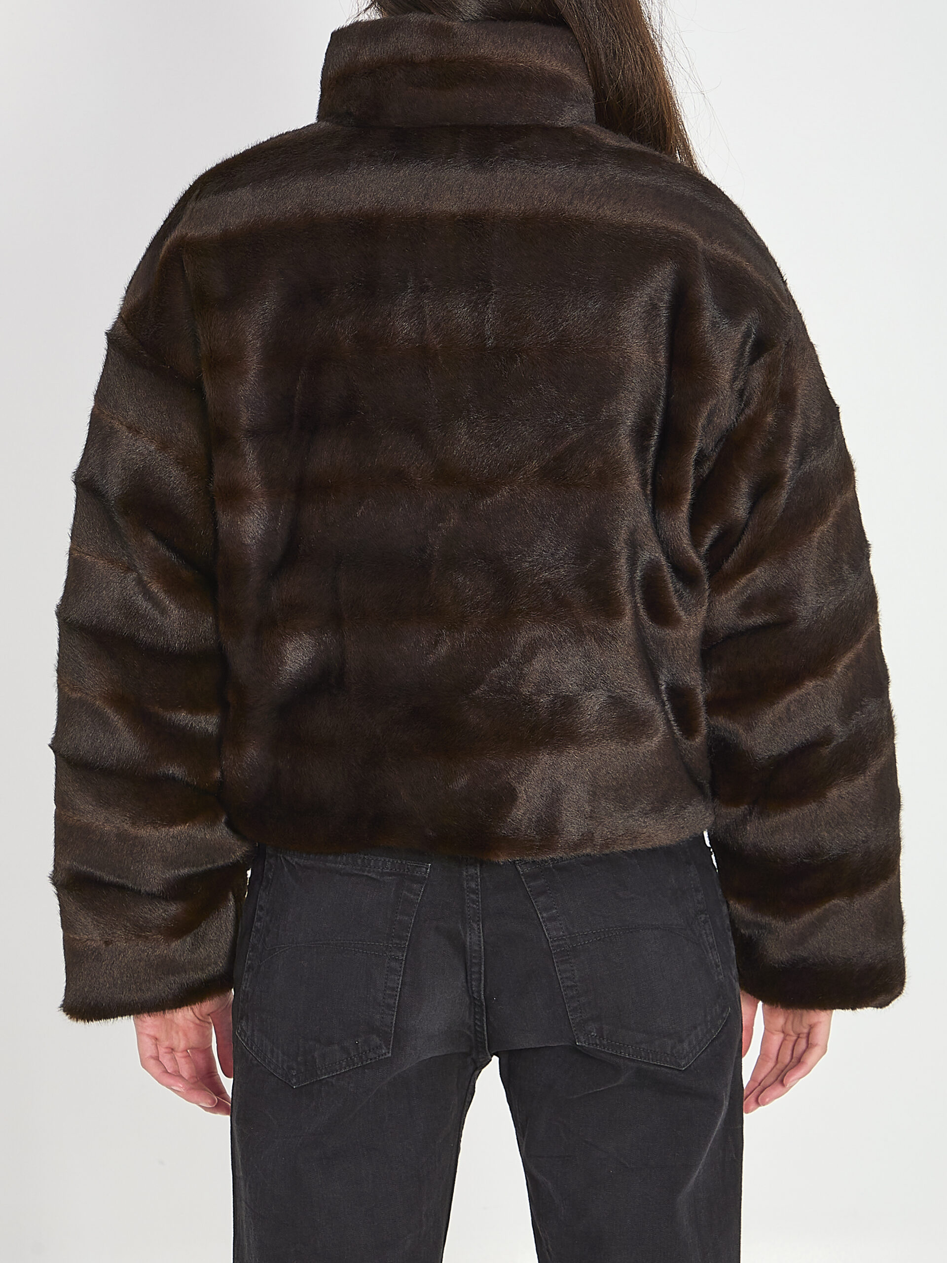 Padded jacket in brown faux fur on one side and black nylon on the other. Features a high collar, front zip closure, two side pockets, cropped cut. Polyester padding. Regular fit.