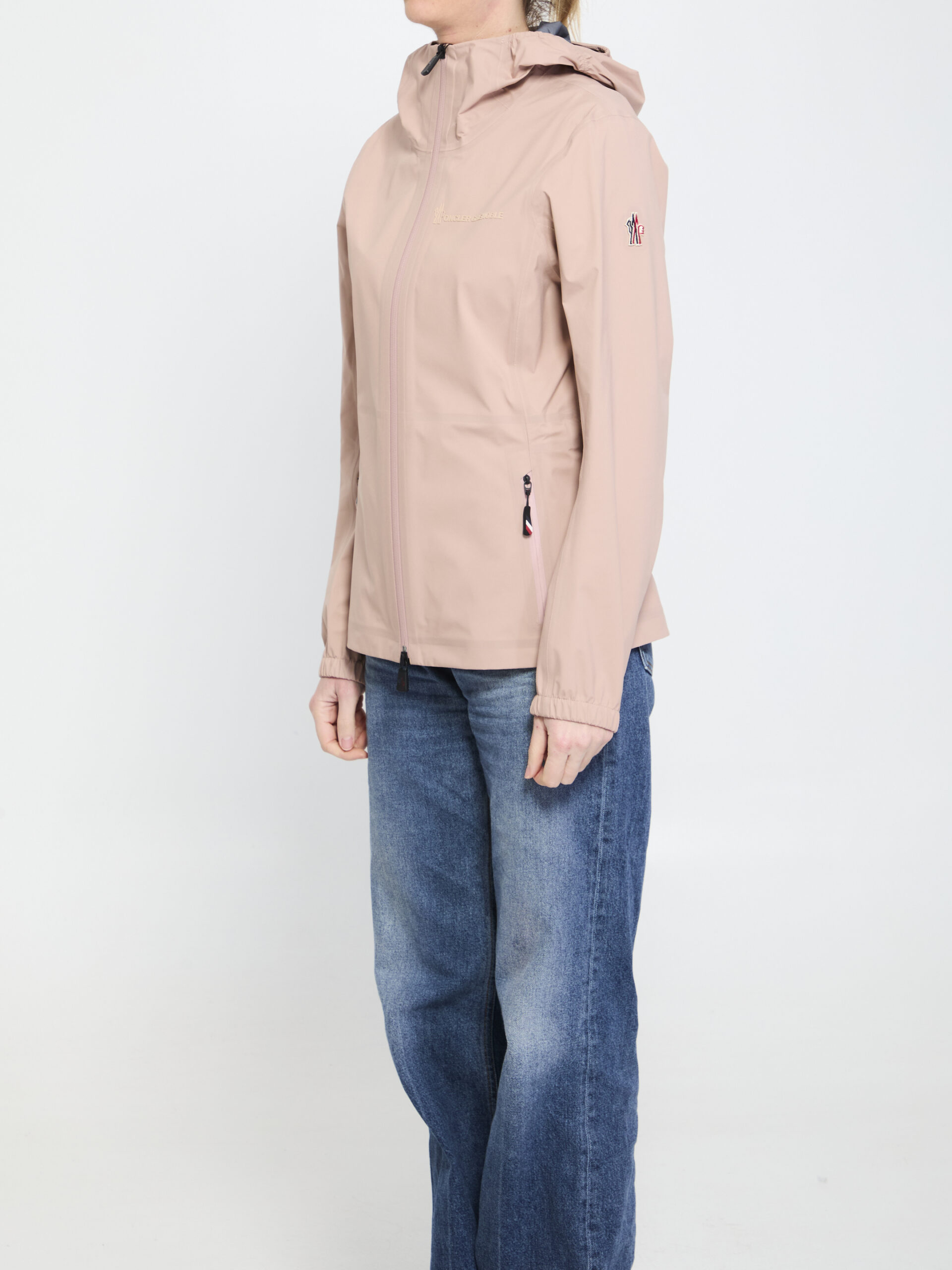 Pink 3L GORE-TEX® laminated wind jacket. It features an adjustable hood with a visor, thermo-sealed seams, YKK® AquaGuard® NATULON® water repellent zip closure, two front zip pockets, an internal drawstring to adjust the waist, an applied Moncler Grenoble signature on the chest, a logo patch on the sleeve, elasticated cuffs, a RECCO® reflector. Regular fit.