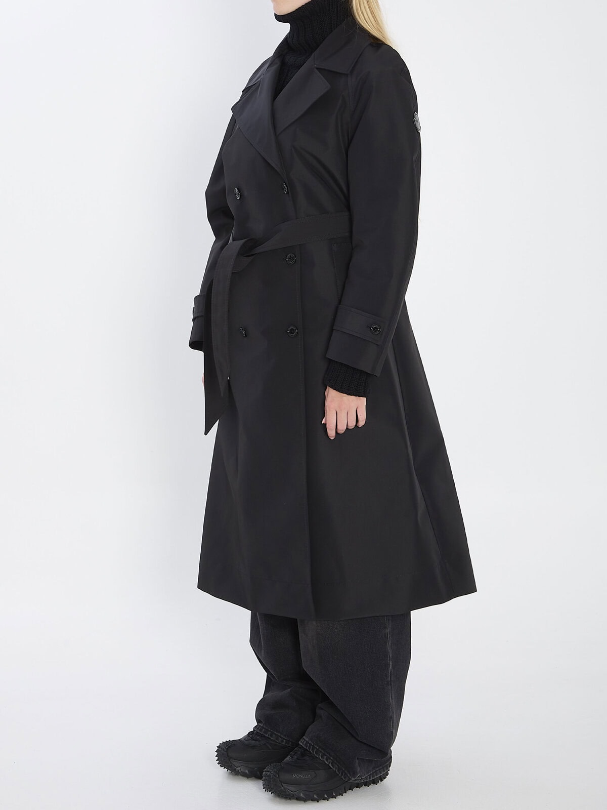Waterproof trench coat in matte black polyester. Features peaked lapels, double-breasted front with six buttons, removable belt, two front flap pockets, buttoned cuffs, adjustable back vent with central button, removable internal fabric shoulder straps, and a logo patch on the sleeve. Regular fit.