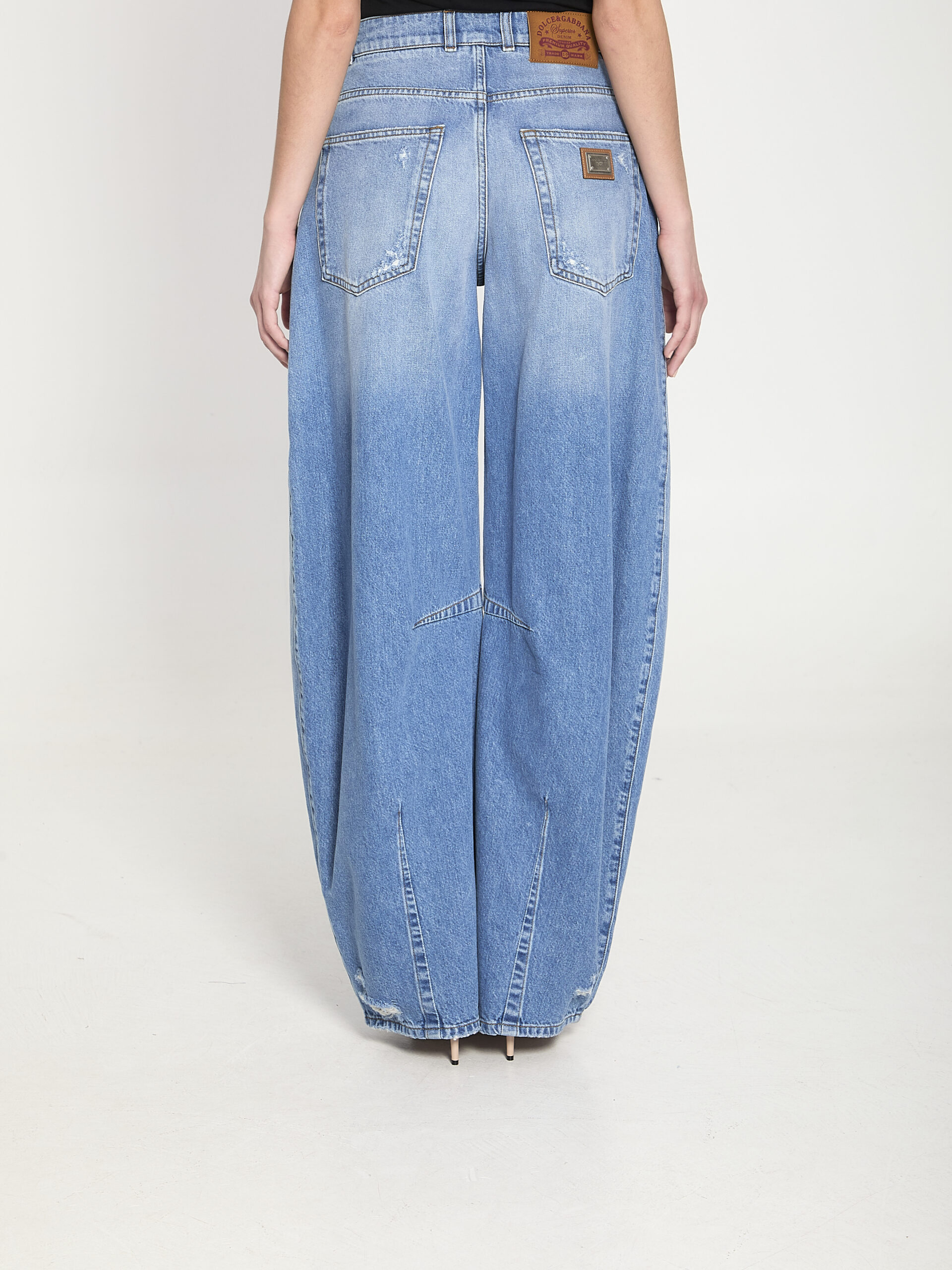 Light blue cotton denim jeans. Feature belt loops, button and front zipper closure, five pockets, leather label and logo patch on the back, ripped detailing, stitched tuck details at the knee, mid rise, barrel leg. Regular fit.