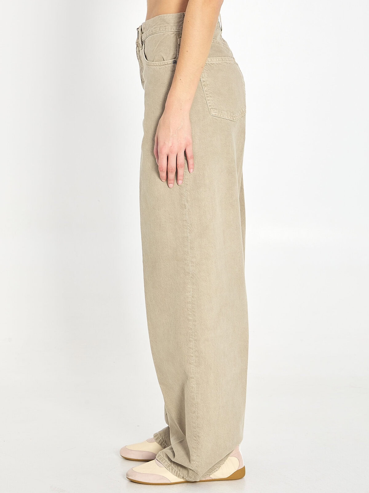 Beige cotton-linen blend twill jeans. They feature belt loops, a button-front closure, five pockets, a suede logo patch on the back, a medium waist, and straight-leg fit. Regular fit.
