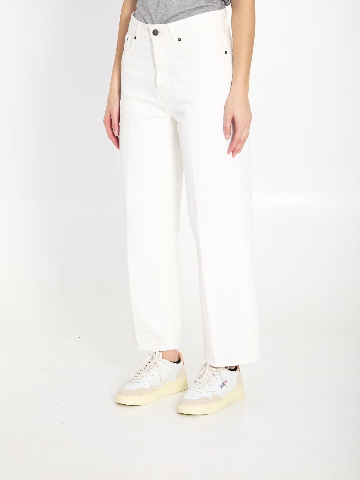 Betty Bull white cotton denim jeans. They feature belt loops, a front button closure, five pockets, a suede leather patch with logo on the back, ironed-in front and back creases, a mid-rise waist, and a slightly cropped wide leg. Regular fit.