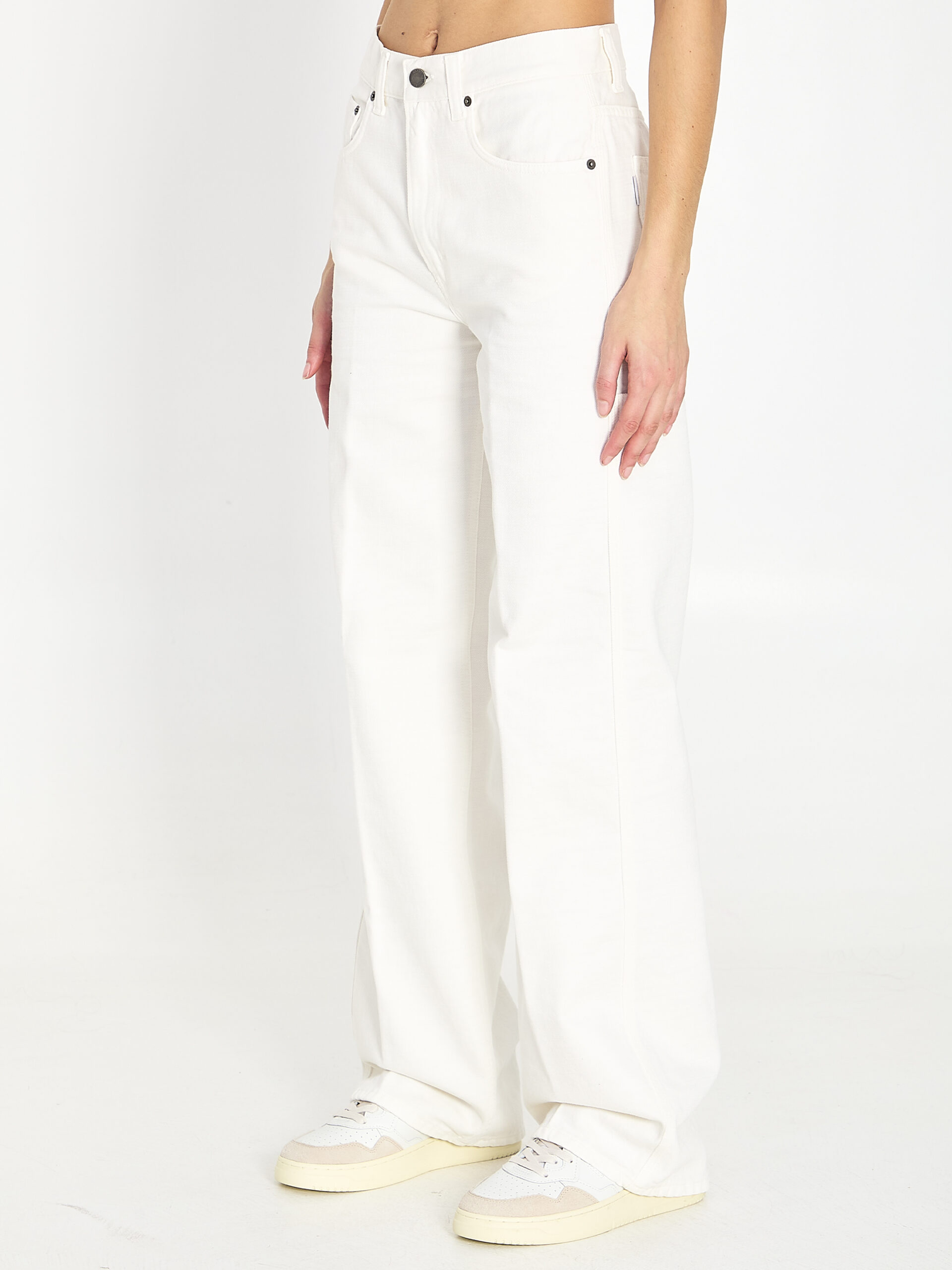 White cotton denim jeans. They feature belt loops, a zip and button front closure, five pockets, a suede logo patch on the back, a medium waist, and a wide leg. Regular fit.