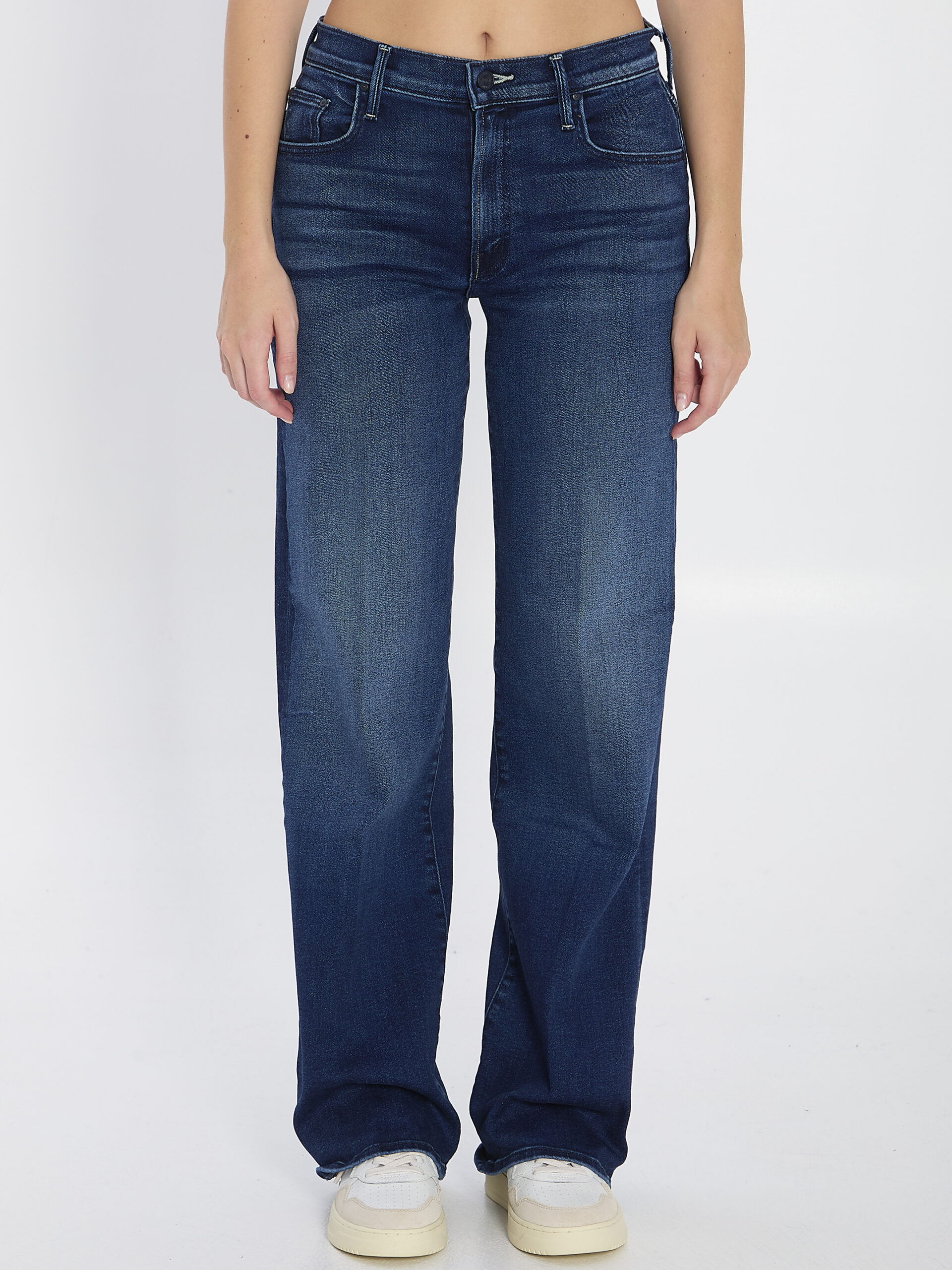 Blue cotton denim jeans with slight stretch. Mid-rise, wide-leg model featuring belt loops, zip and button closure, and five-pocket design. Regular fit.