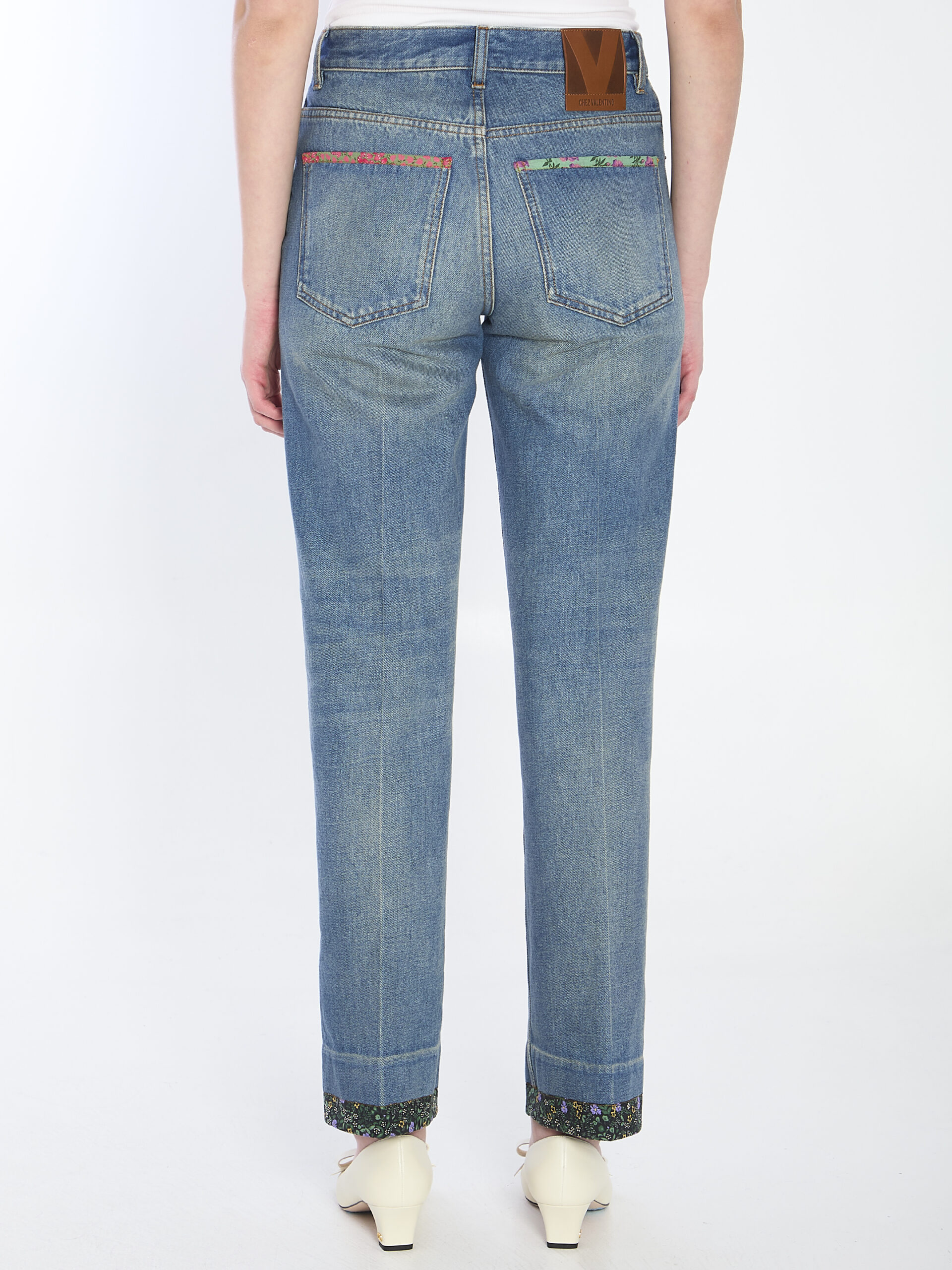 Medium Blue cotton denim jeans. They feature a button and zip closure, belt loops, five pockets with floral print edges, a brown leather Chez Valentino patch on the back, straight legs with pleats, and printed edges at the hems.