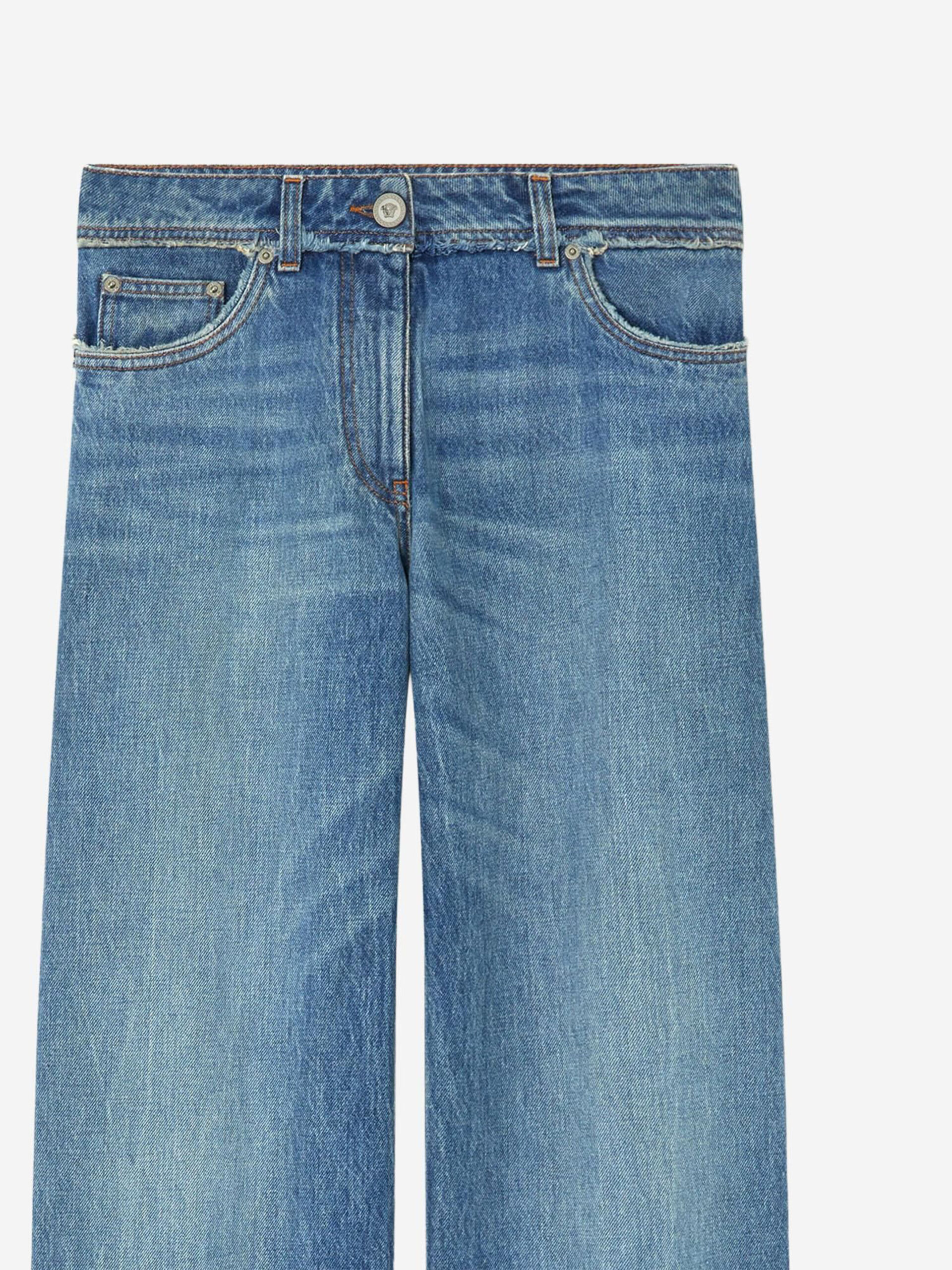 Medium stone washed cotton denim jeans. They feature belt loops, a front Medusa button closure and zip, five pockets, a leather patch with an applied logo on the back waist, raw cut edges, frayed details at the waist and on pockets, a high waist, and wide legs. Regular fit.