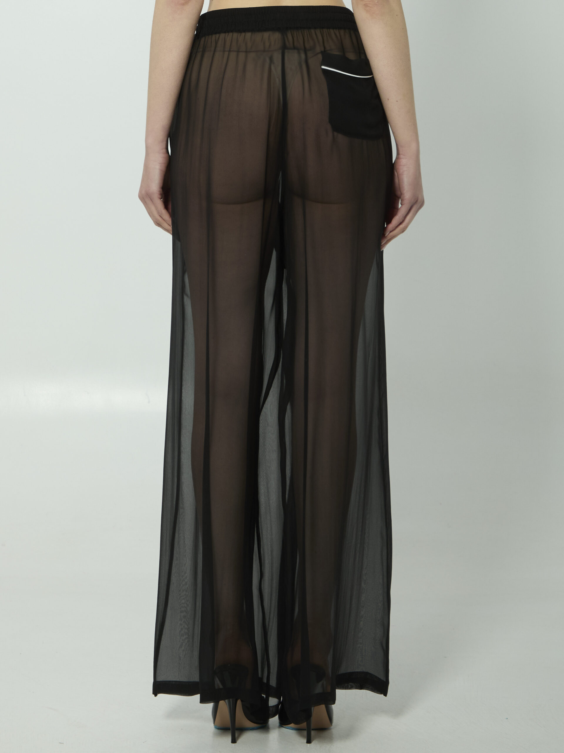 Black see-through silk chiffon trousers. Feature elasticated drawstring waist, two side pockets, one patch pocket at back, mid waist, wide leg. Relaxed fit.