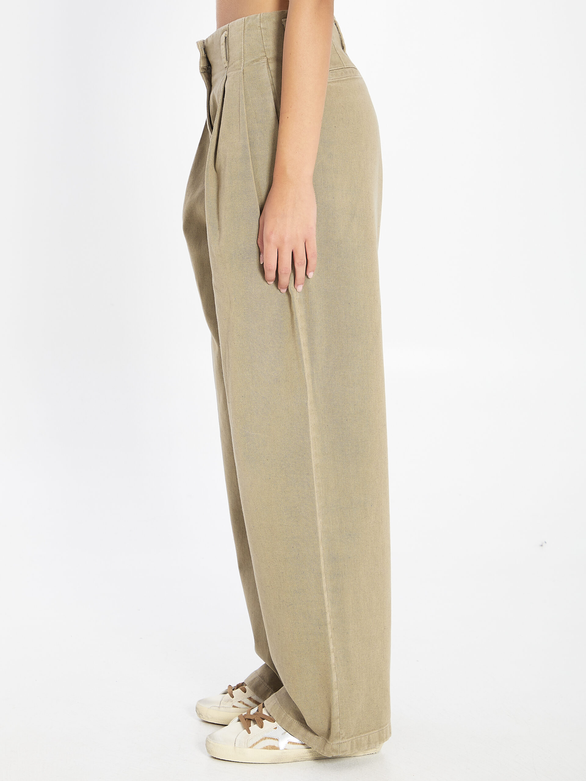 Khaki cotton-blend trousers. Features belt loops, zip, button, and hook closure, two slant front pockets, two welt back pockets, front pleats, star logo detail on the back, and wide leg. Relaxed fit.