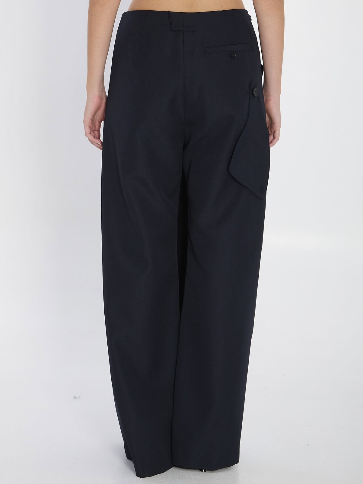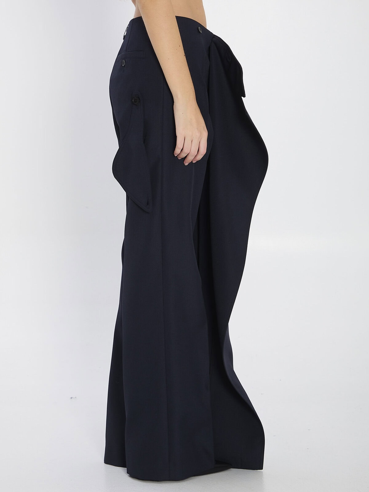 Pantaskirt in a wool and polyester blend in navy blue. The trouser features a button, hook and zip closure, front pleats, and one back welt pocket with button. The skirt overlay has a side trench-style button closure. Regular fit.