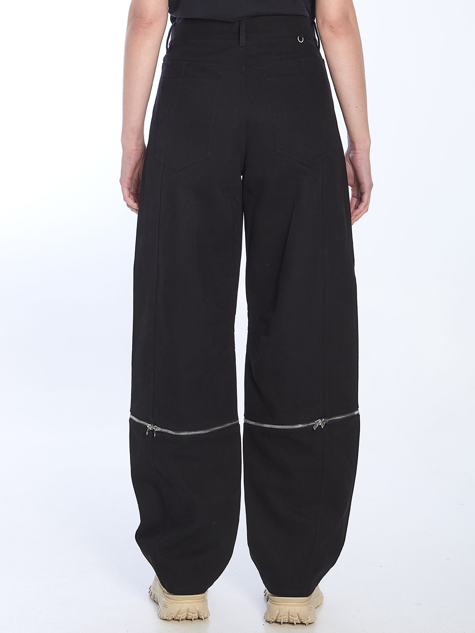 Black cotton baggy pants with a front zipper and button, side and back pockets, belt loops. It also features a small metal ring on the back and zippers at the knees.