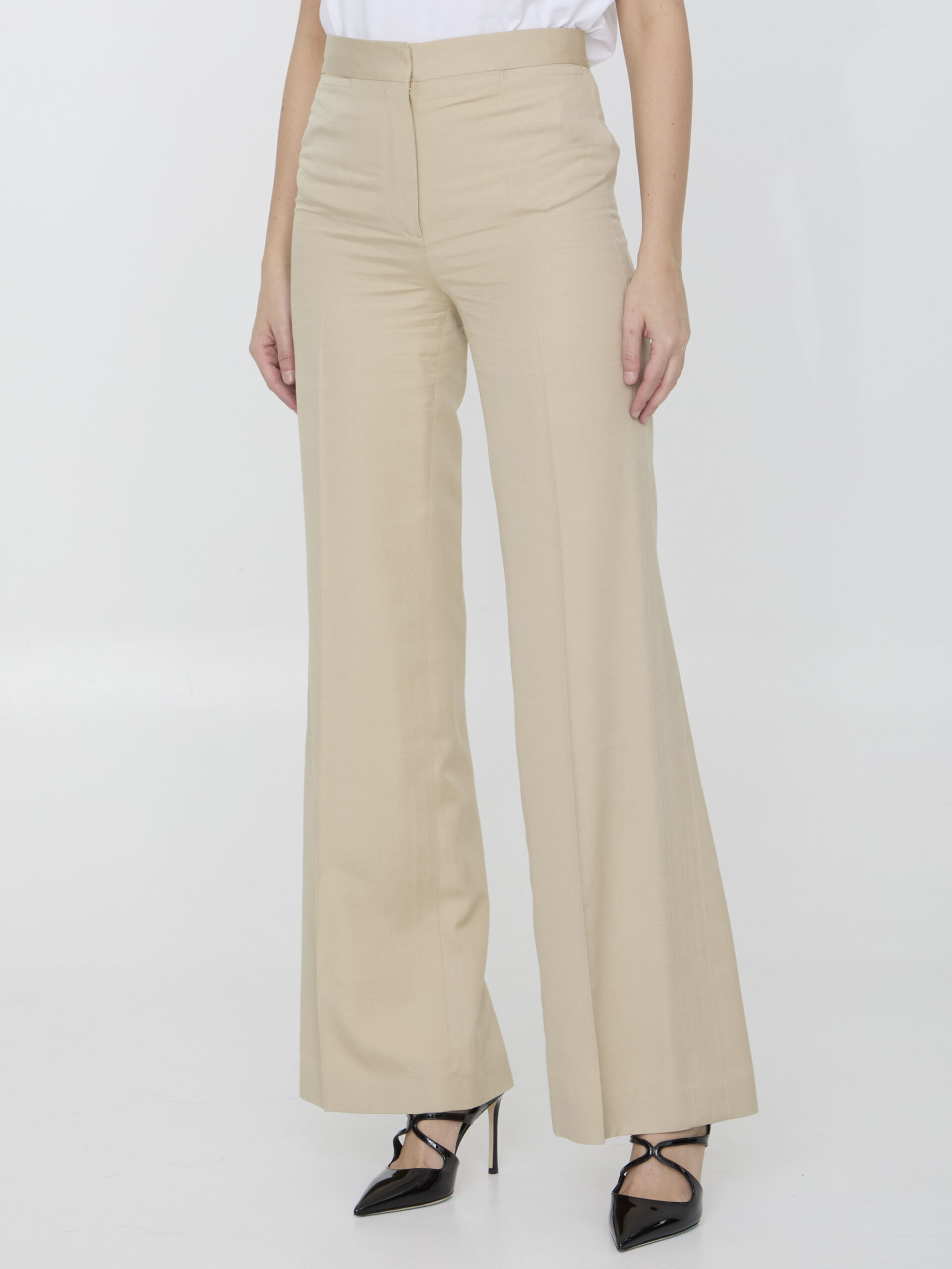 Iconic flare pants in sand-colored viscose. It features zip, button and hook-and-eye closure, two side welt pockets and one rear welt pocket. Regular fit.