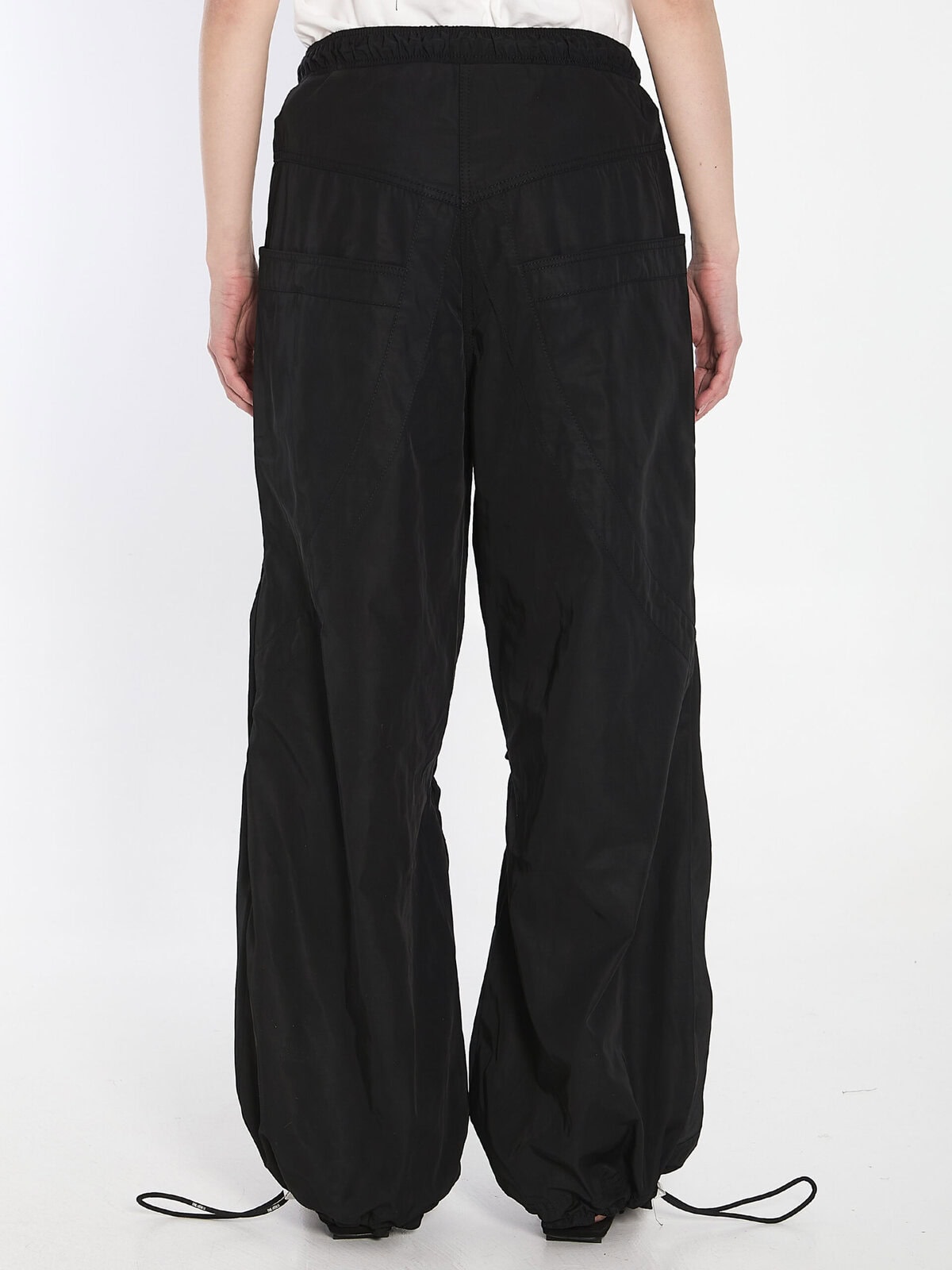 Black oversized trousers with an elastic waistband and drawstring. They feature two side pockets with zippers, drawstrings on the legs and hem, and two patch pockets with snap buttons on the back. Regular fit.