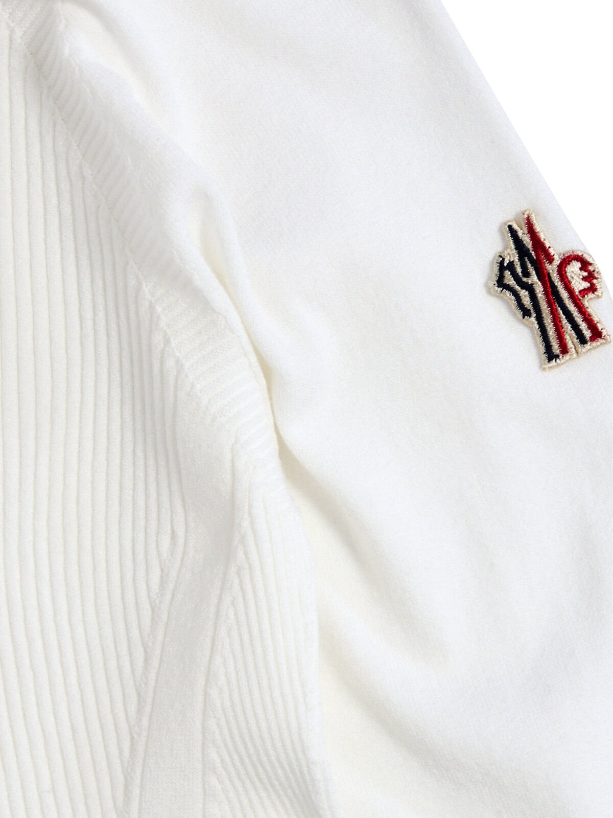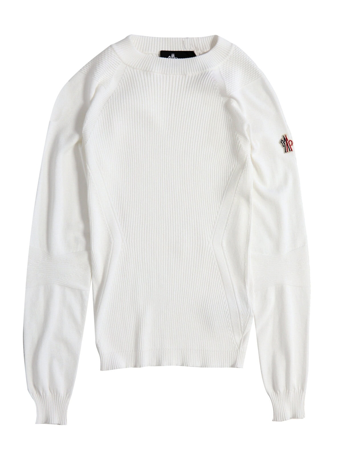 White polyester and viscose ribbed knit sweater. It features a crew neck, long sleeves, an applied logo patch on the sleeve, embroidered Moncler signature on the sleeve. Slim fit.