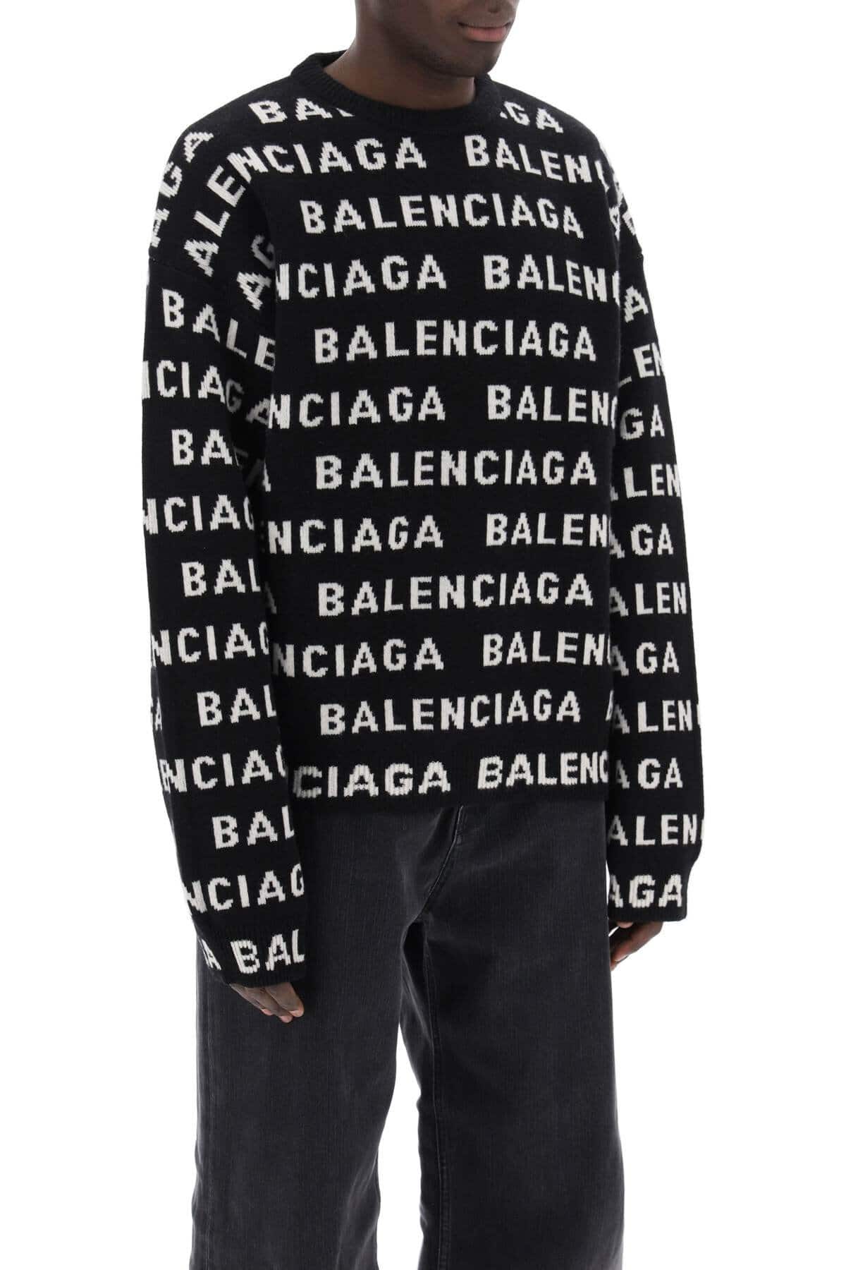 This Balenciaga crew neck pullover is made of a wool blend and features a contrasting jacquard logo throughout. The oversized fit is finished with ribbed cuffs, hem, and collar. The model is 177 cm tall and wears a size S.