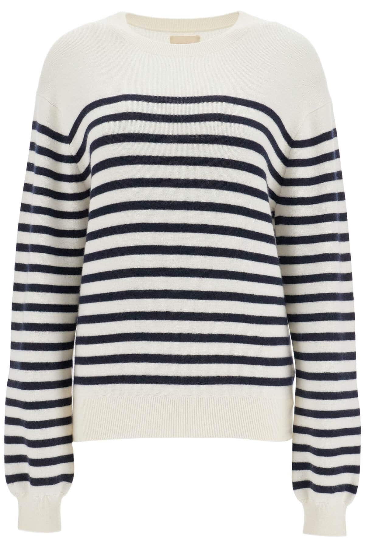 The KHAITE merino wool sweater offers timeless elegance. With white and navy blue stripes, a loose fit, and chic design, it is perfect for spring summer fashion. Comfort and style in a single piece.