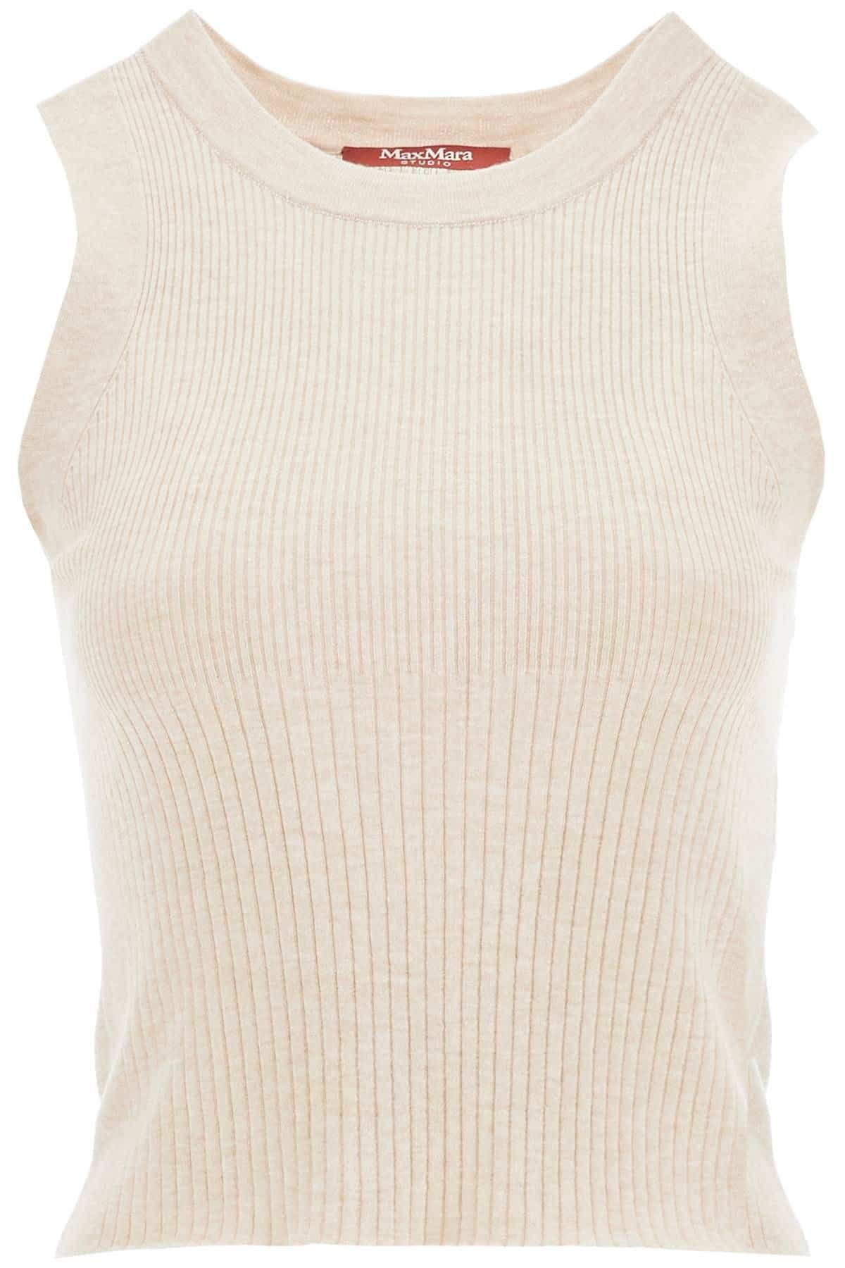 This sleeveless Max Mara Studio crew neck top is made from a luxurious blend of wool and silk, featuring a unique ribbed design that accentuates the feminine silhouette. It has a fitted cut and the model is 177 cm tall and wearing size S.