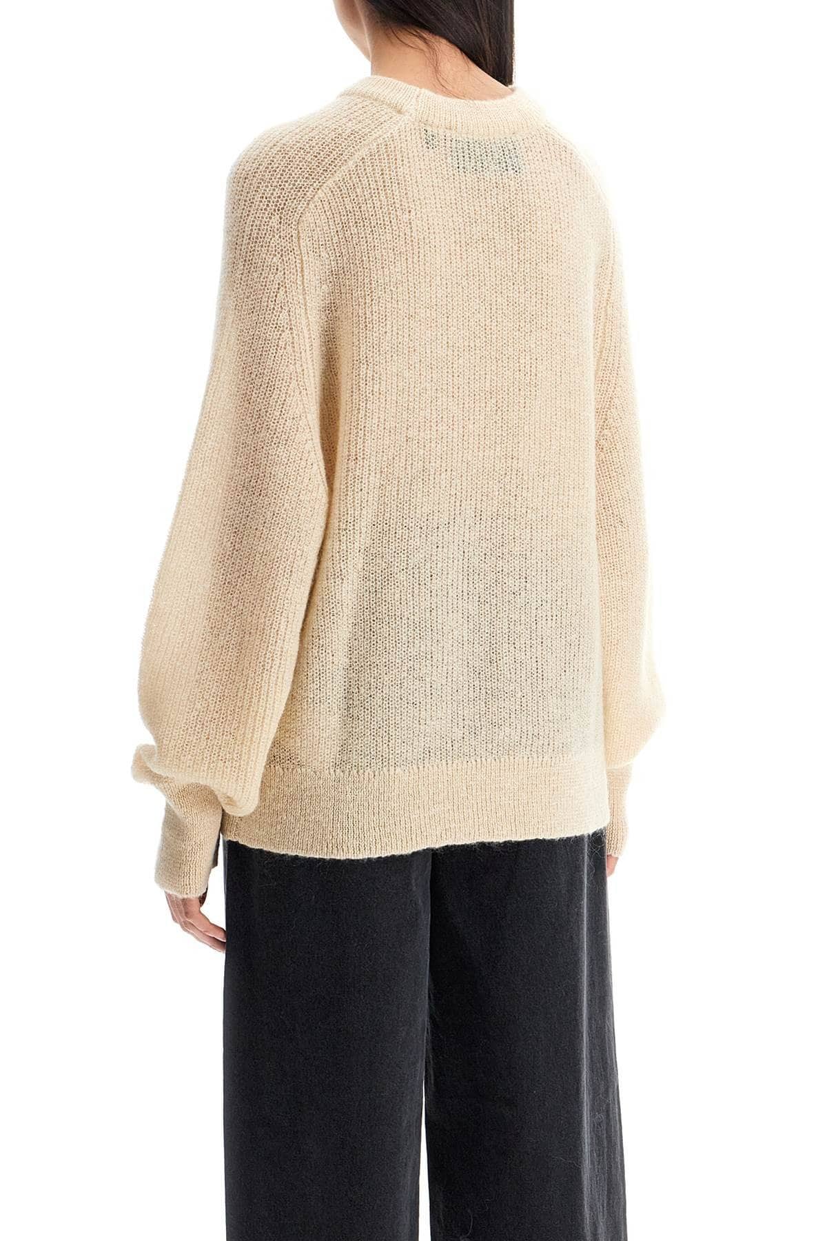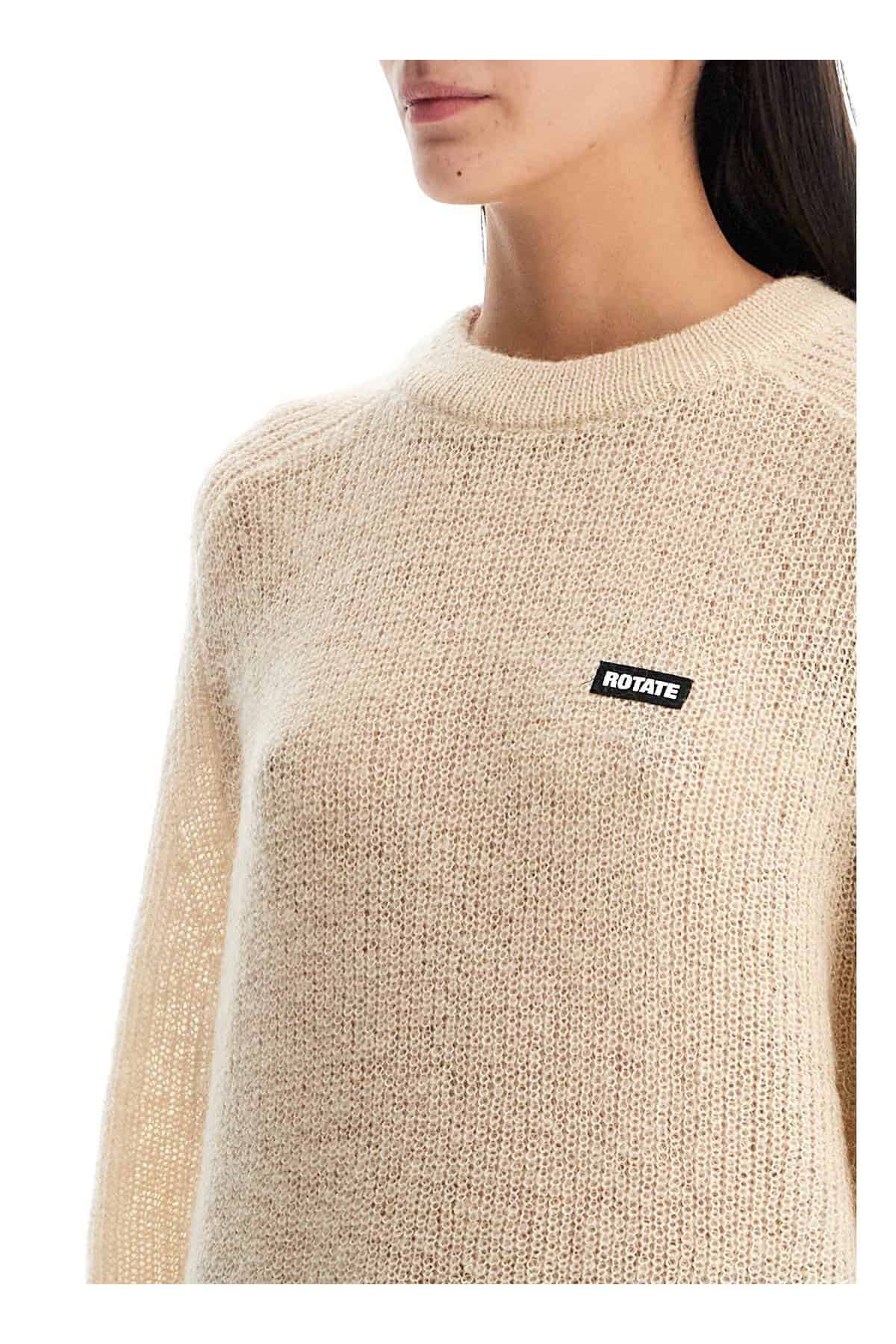 This soft ribbed pullover is made of a blend of mohair, featuring an oversized fit with bell sleeves and a logo label sewn on the chest. The model is 177 cm tall and wears size EU 34.