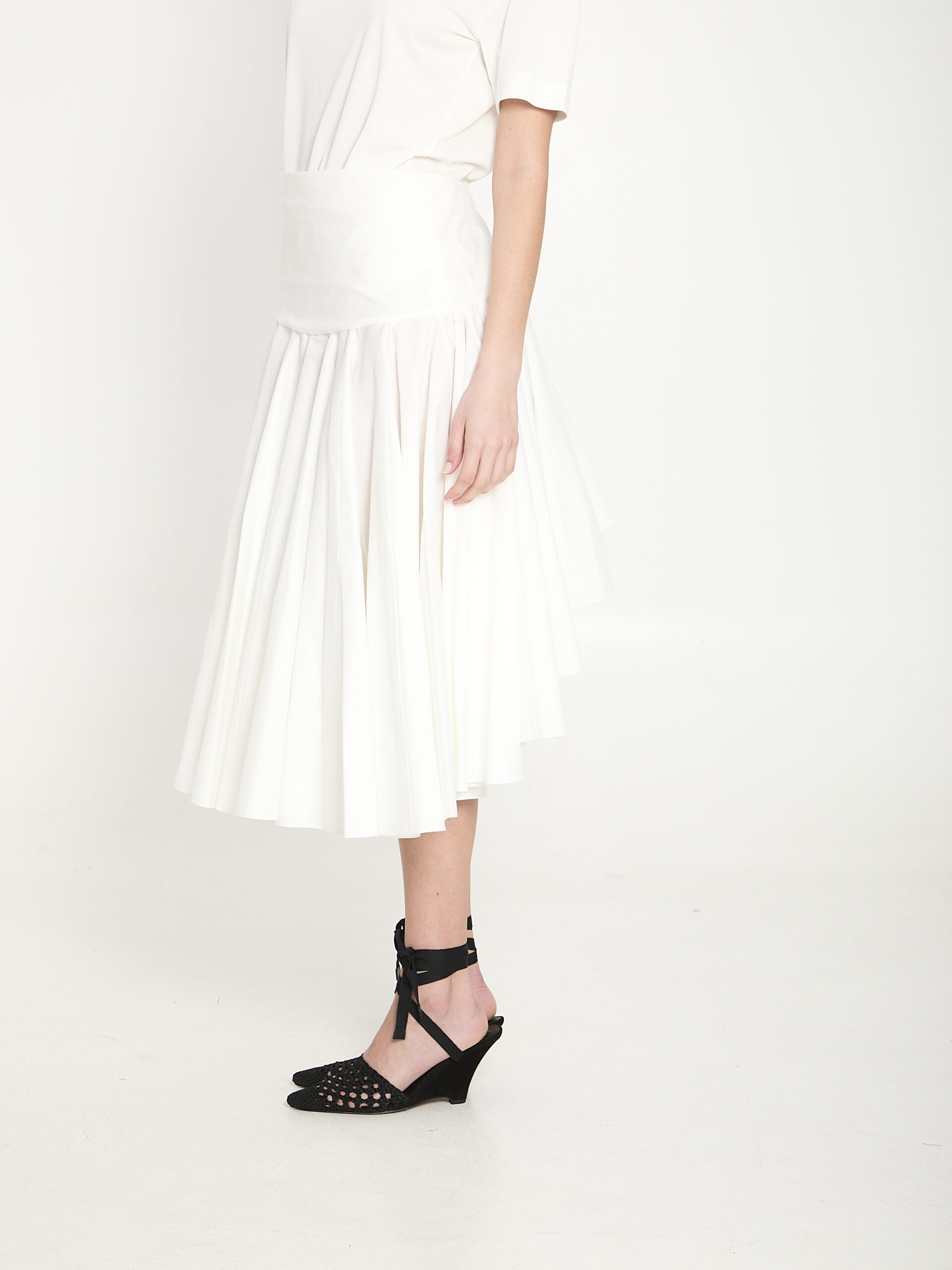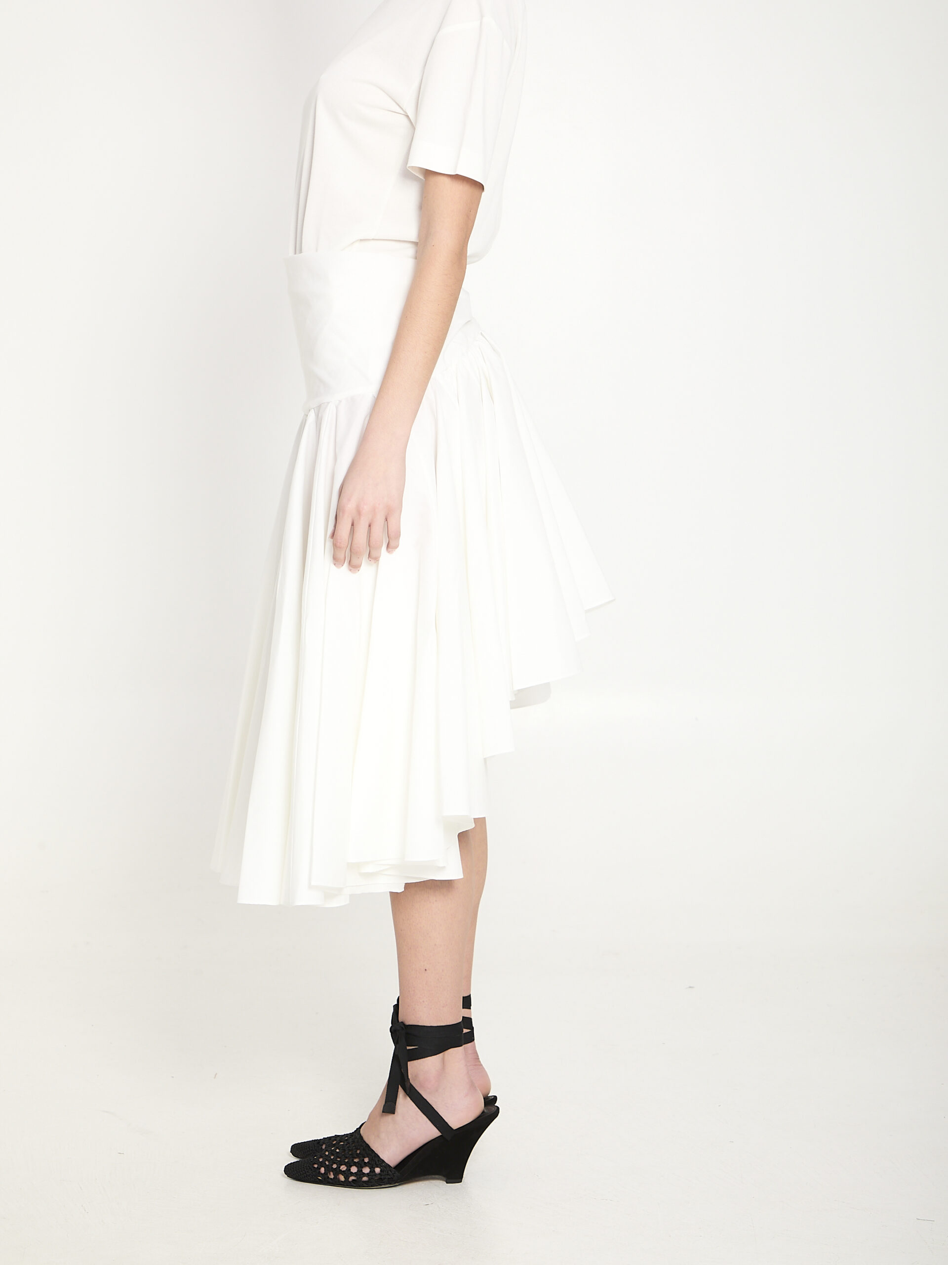 White stretch cotton midi skirt. Features a high, draped waist, flared below the hips with godet, cascading mini length at the back, back zipper closure. Regular fit.