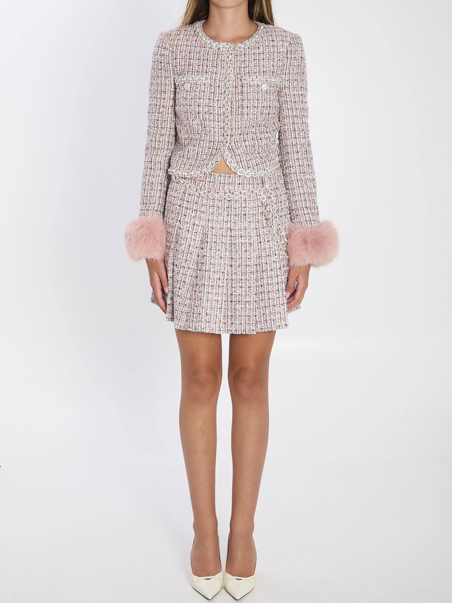 Pink bouclé pleated mini skirt. Features concealed side closure with belt, belt loops, removable crystal chain belt, and full lining. Slim fit.