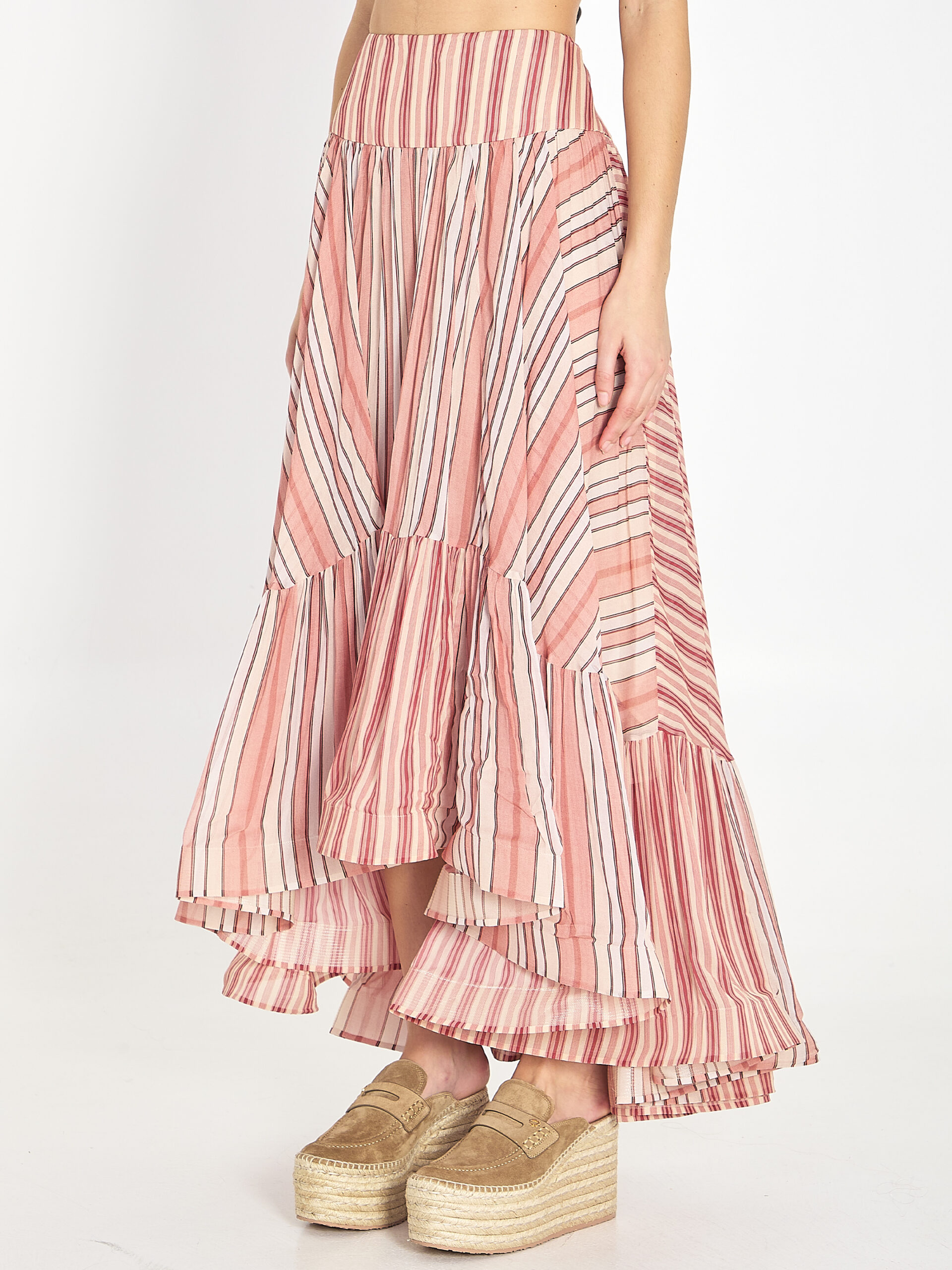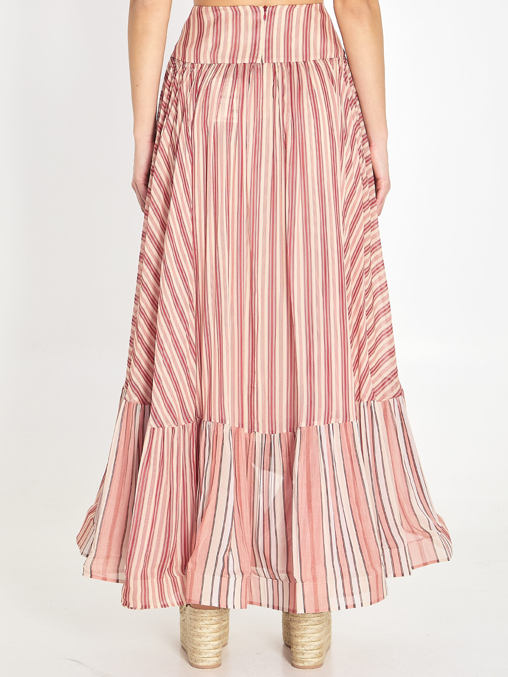 Midi skirt in viscose with a red striped pattern. It features an elongated structured waist, an asymmetric ruffled hem with a volant, an invisible zipper closure at the back, and a viscose lining. Slightly fitted at the waist and comfortable at the hips.