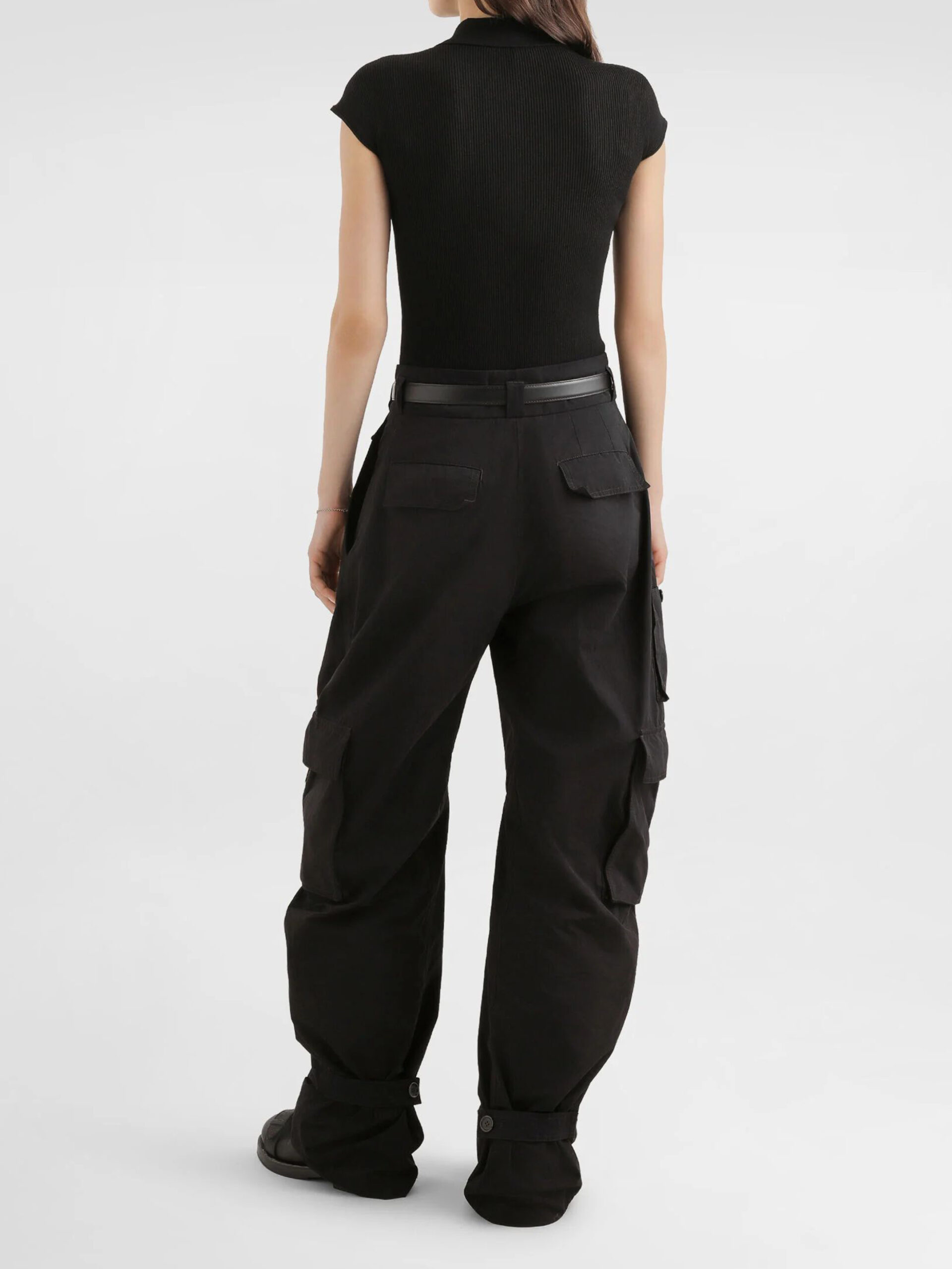 Black viscose-blend ribbed top. It features a point collar, a polo-style three-button placket with jeweled buttons, is sleeveless, and has a cropped length. Fitted fit.