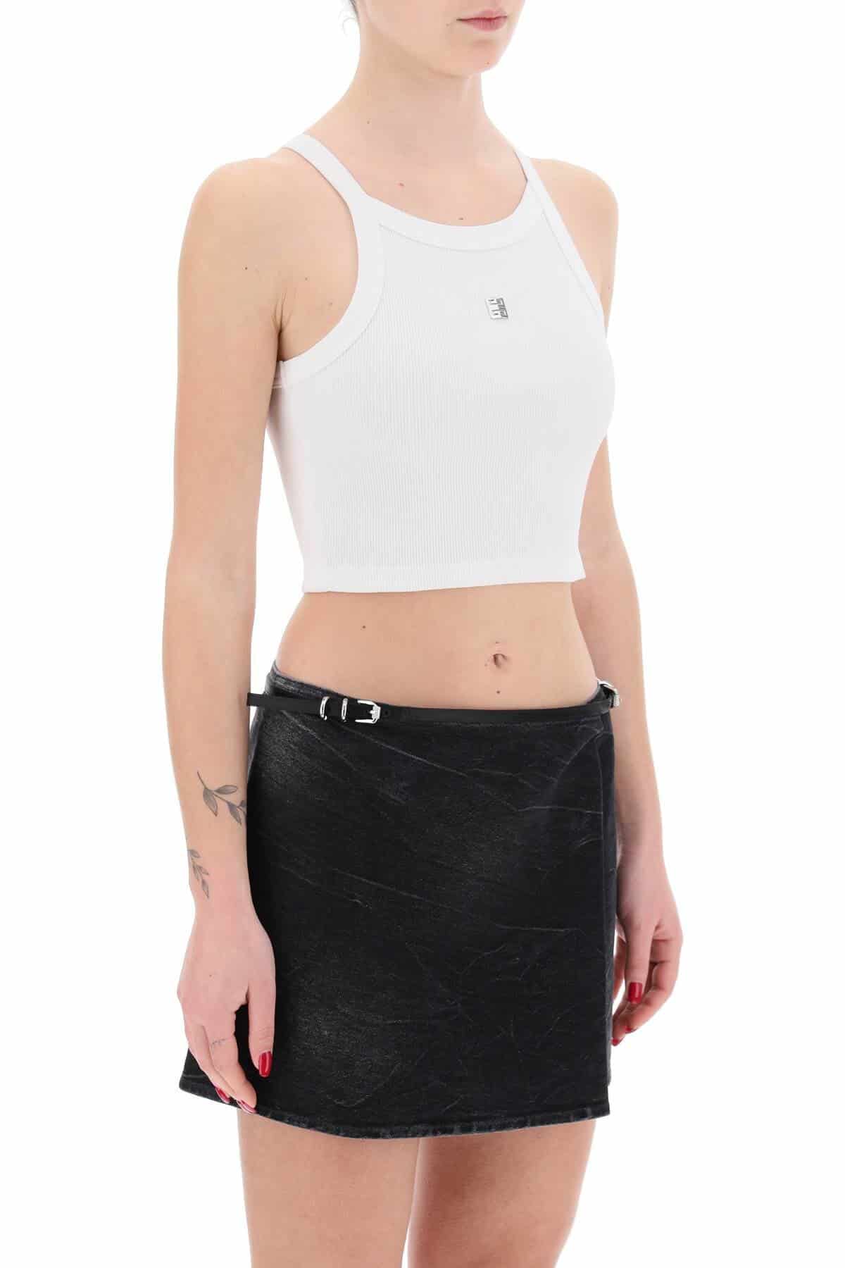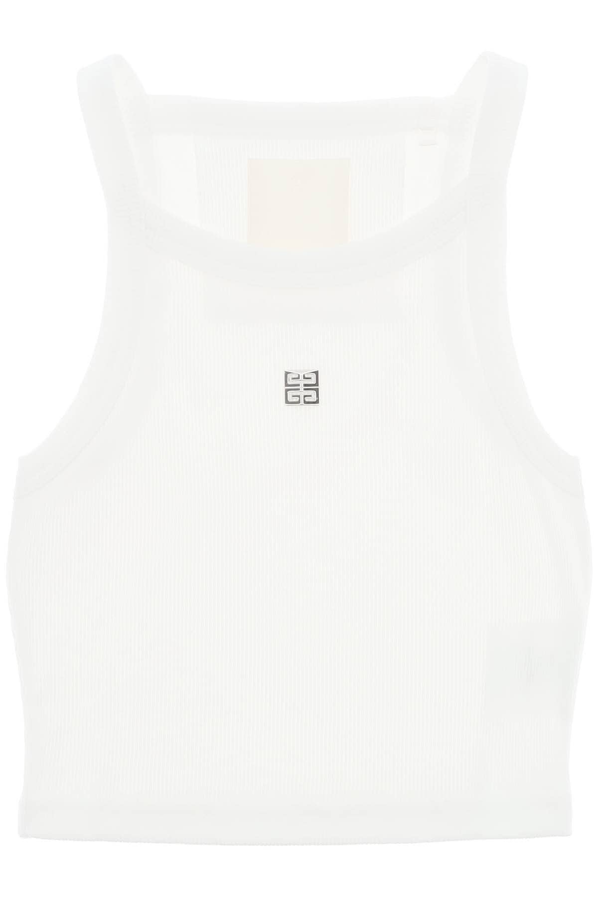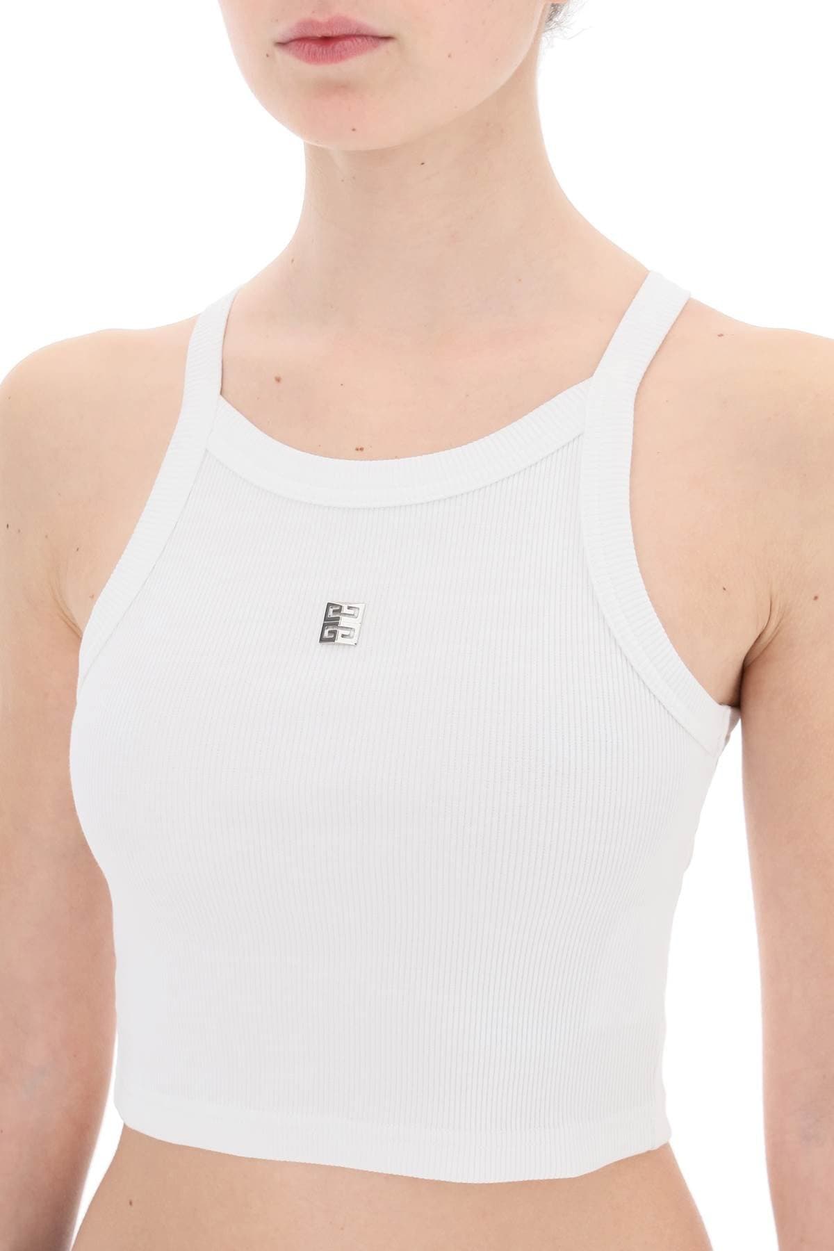 This Givenchy sleeveless crop top is made of ribbed cotton jersey, featuring a fitted silhouette with a round neckline and embellished with a silver 4G metal plaque on the chest. The model is 177 cm tall and wears a size XS.