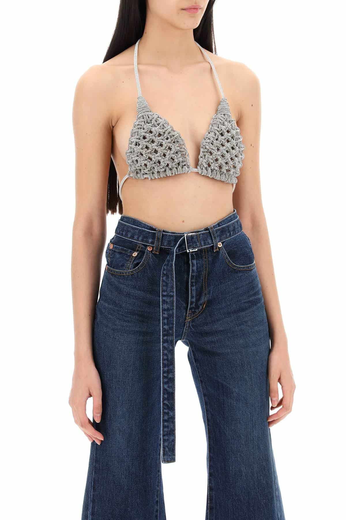 MVP Wardrobe halter triangle top designed in collaboration with Hibourama. Made of hand-braided cords studded with micro crystals, it features an adjustable lobster-clasp fastening at the neck and back. The model is 177 cm tall, one size fits all.