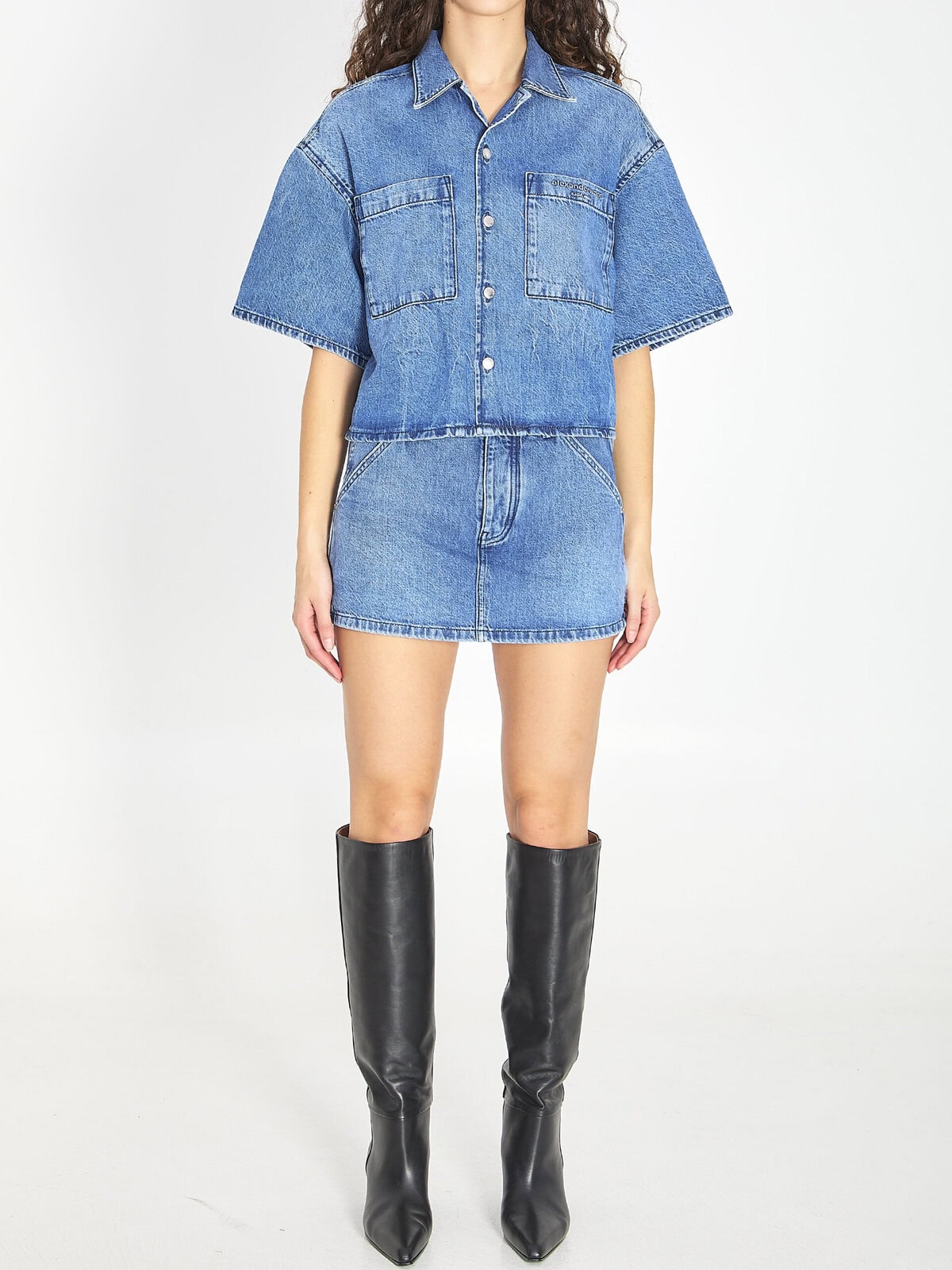 Vintage marbled light blue cotton denim shirt. It features a pointed collar, button-front closure, short sleeves, two front patch pockets with an embossed Alexander Wang signature, and a straight hem. Cropped cut. Regular fit.