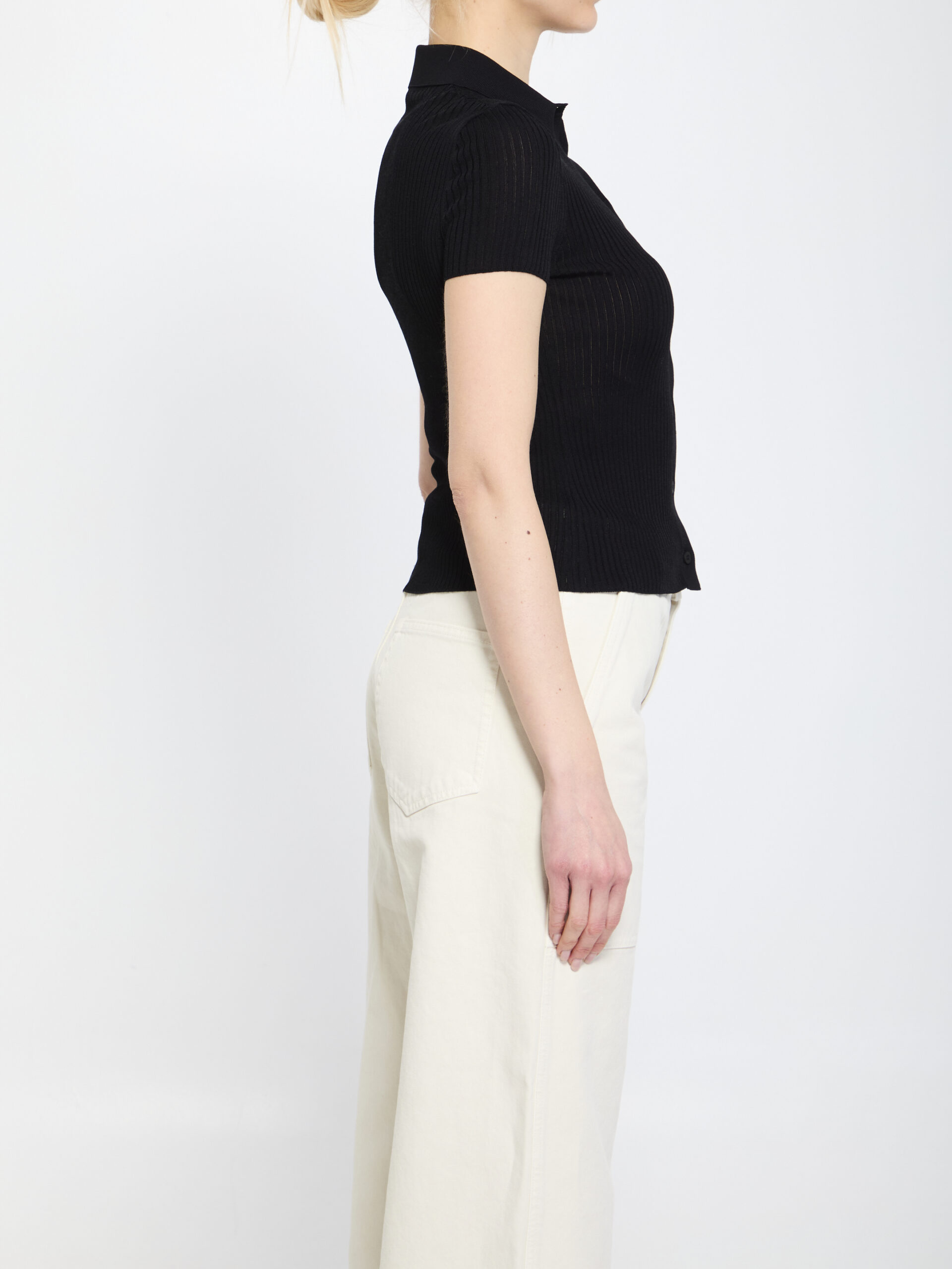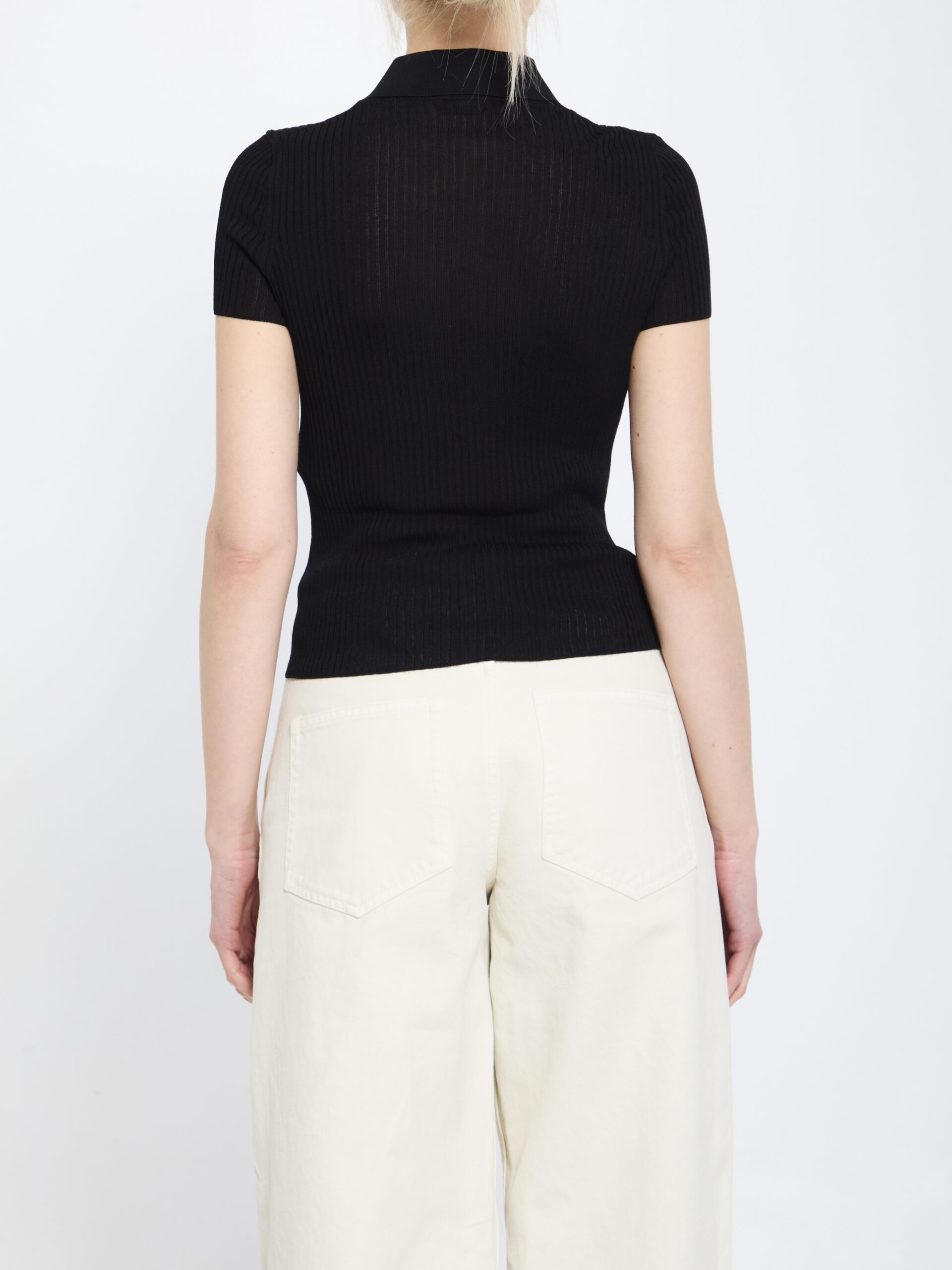 Black viscose and cotton ribbed shirt. It features a point collar with the Balenciaga signature, a front button placket, and short sleeves. Fitted fit.