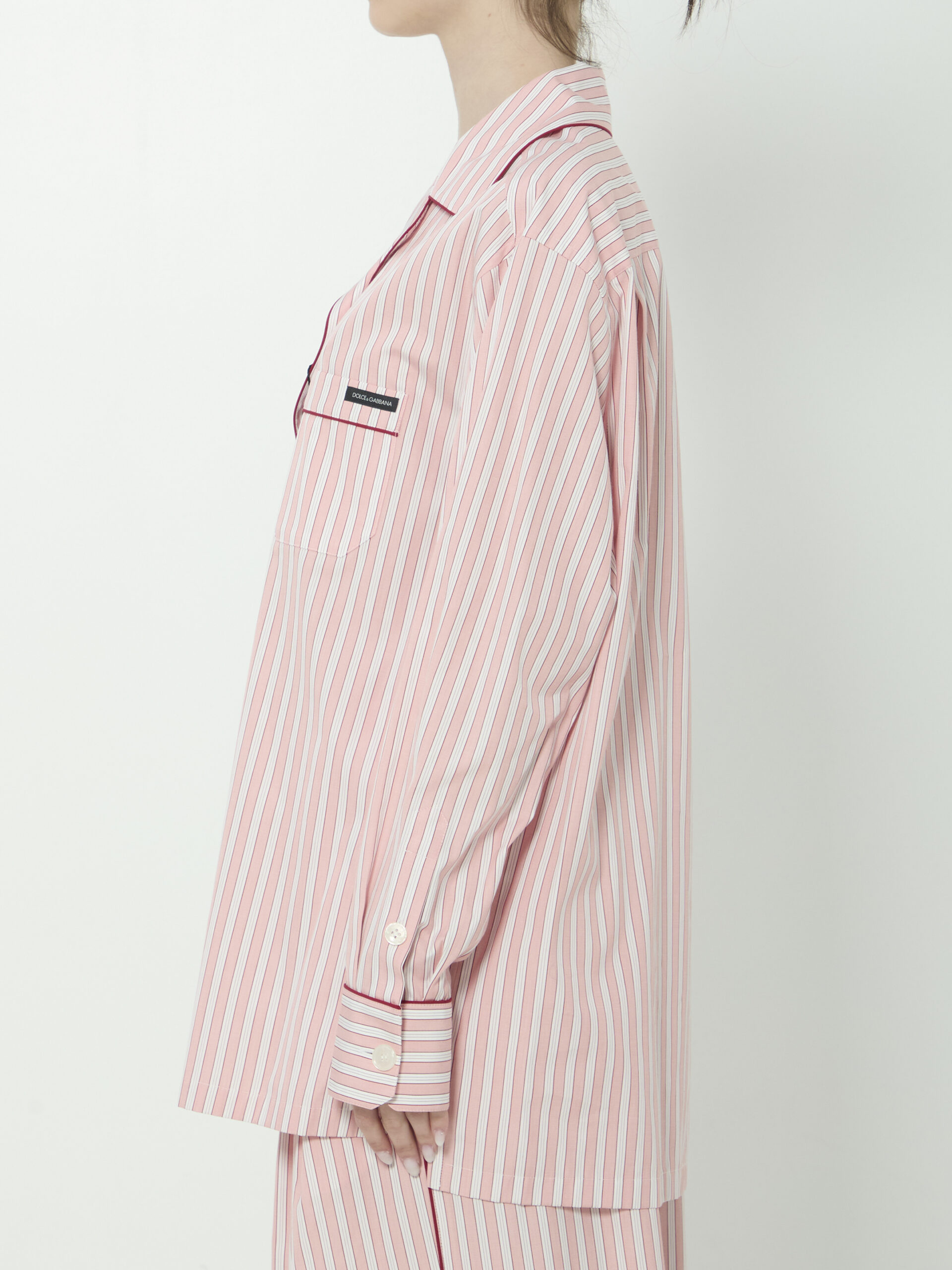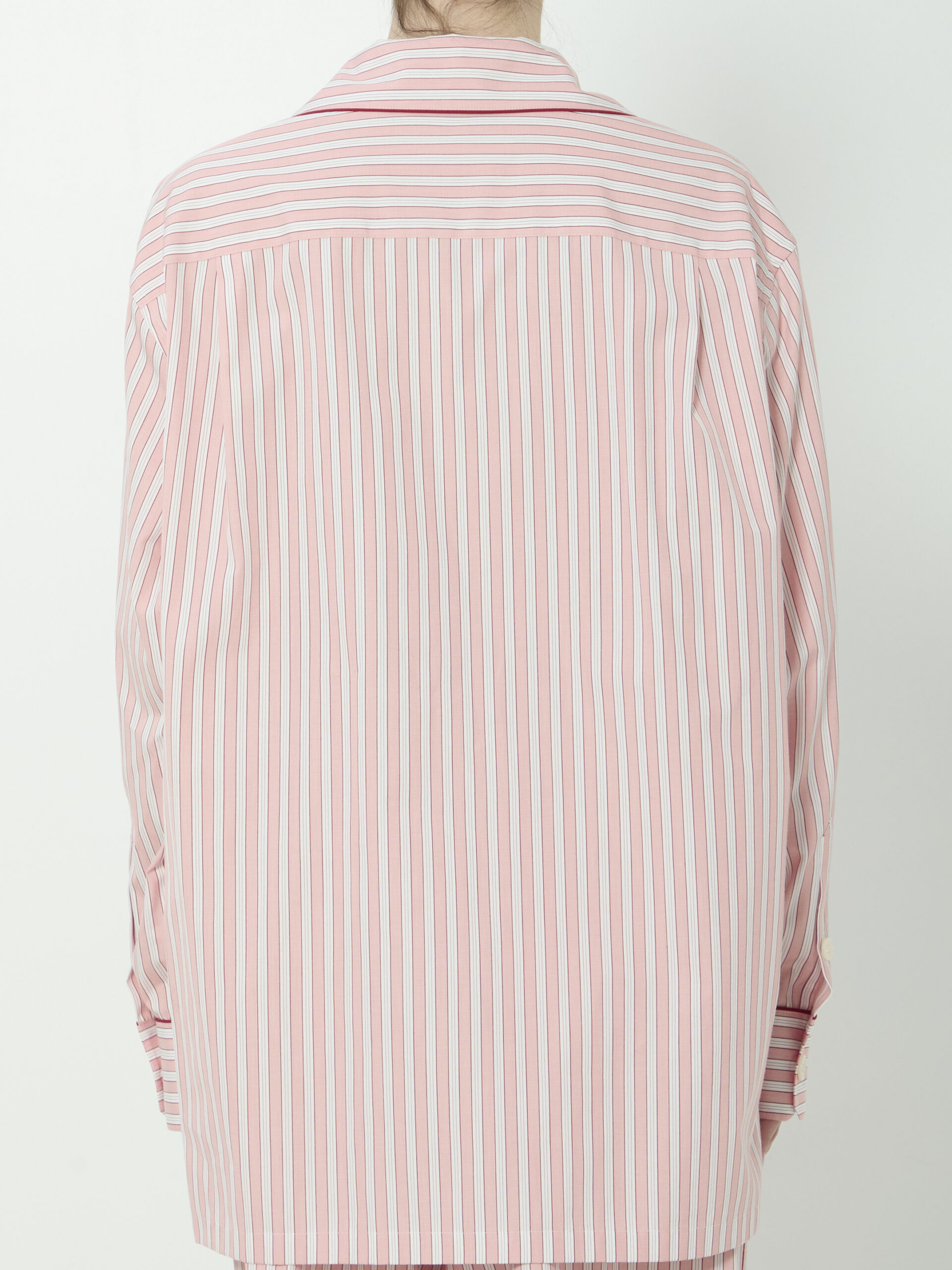 Pink and white striped cotton and silk poplin shirt. Features lapel collar, front button closure with mother-of-pearl buttons, long sleeves, button cuffs, one patch pocket at chest with custom label, two side slits at hem, longer at back, straight hem. Relaxed fit.