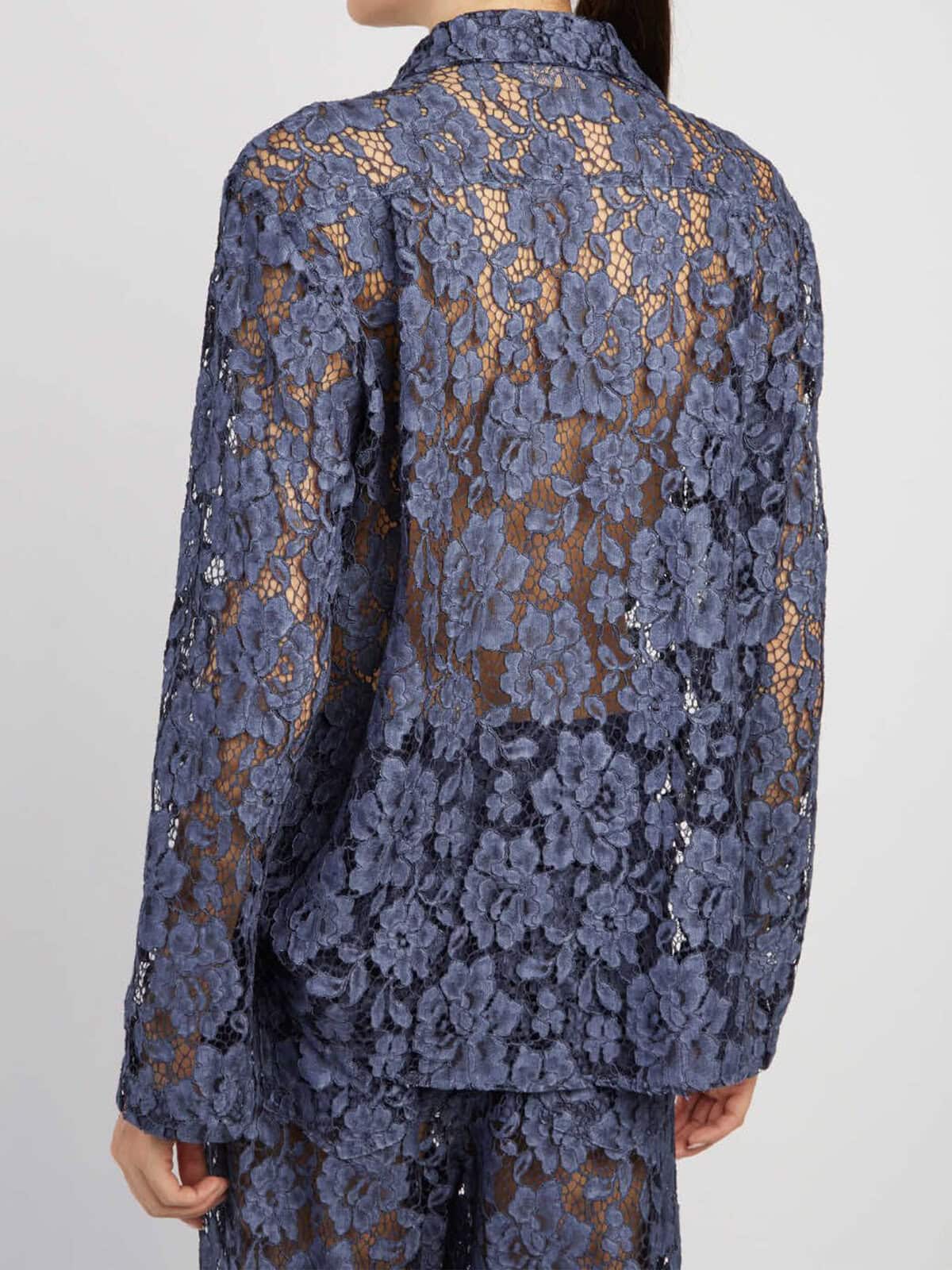 Indigo cotton-blend see-through lace shirt. It features a pointed collar, front button closure, long sleeves, a straight hem. Regular fit.