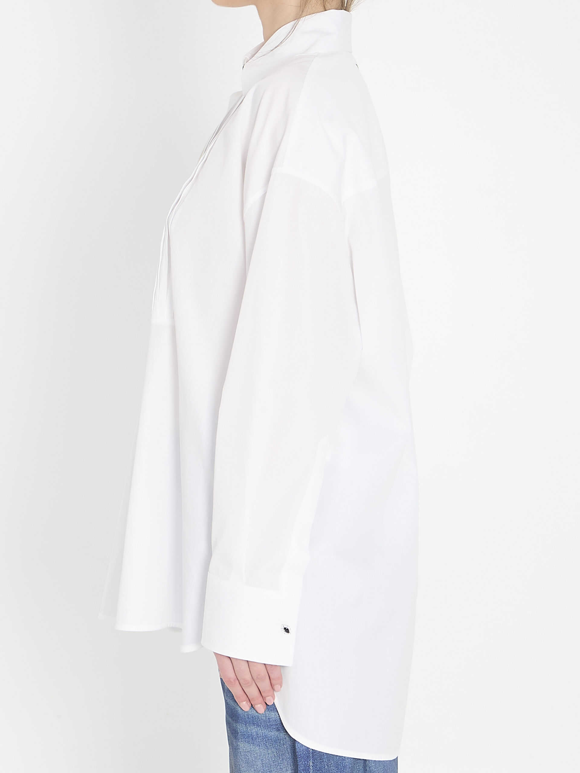 White cotton poplin shirt. It features a pointed collar, a jeweled button at the neck, a hidden button closure at the front, a pleated bib on the front, long sleeves, jeweled cuffs, double star detail on the back, a back yoke, and a rounded hem that is longer at the back. Oversized fit.