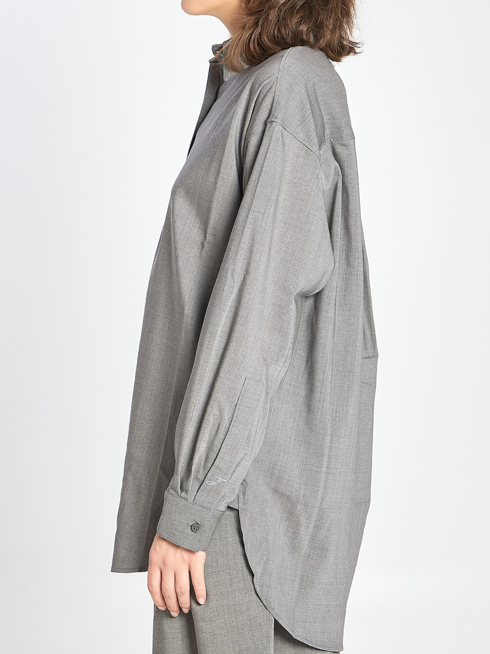 Shirt in grey virgin wool. Features a pointed collar, front button closure, long sleeves, buttoned cuffs, a rounded hem longer at the back, back yoke pleat, and J detail on the back and on the sleeve. Relaxed fit.