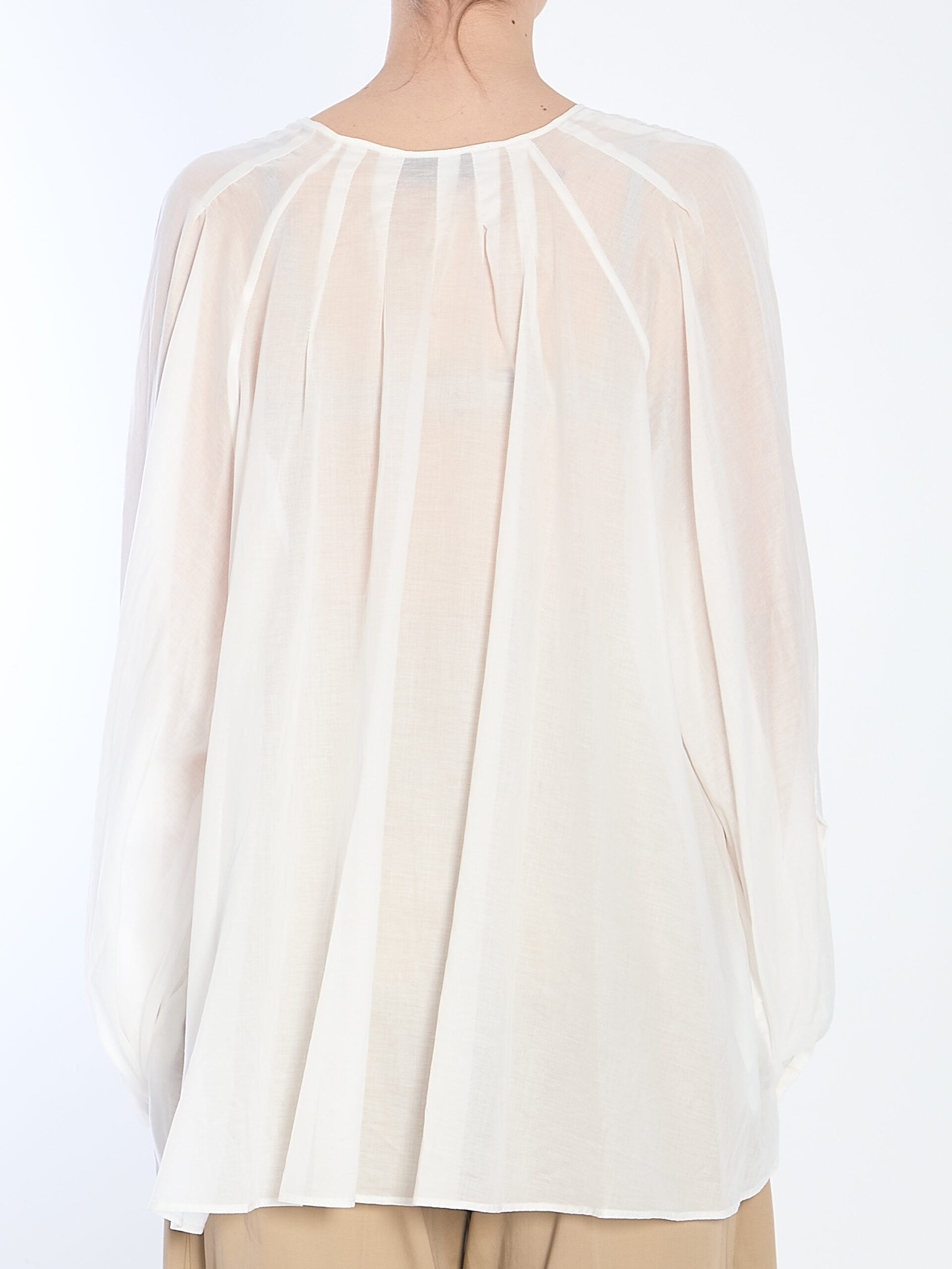 Biro round-neck blouse in lightweight white cotton blend. It features a front button closure, pleats across the entire upper part, wide long sleeves with button cuffs, two side seam pockets, and a wide back. Oversized fit.