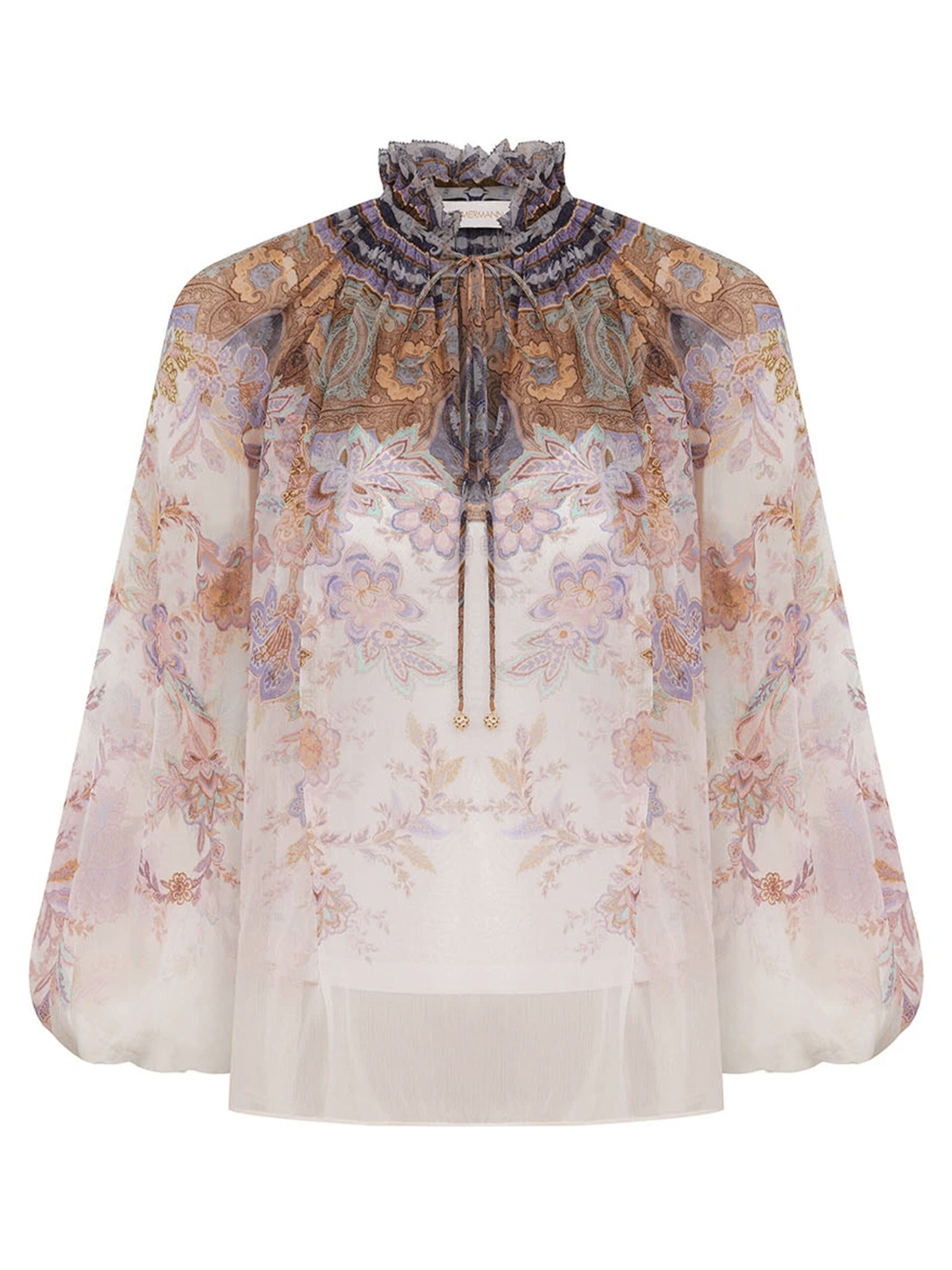 Viscose blouse in cream and blue Kindred Spirit all-over Paisley print. Features a ruffled high neckline, V-neck, drawstring cord with beaded tips, long puff sleeves with elasticated cuffs, voluminous gathering, removable under-slip. Relaxed fit.