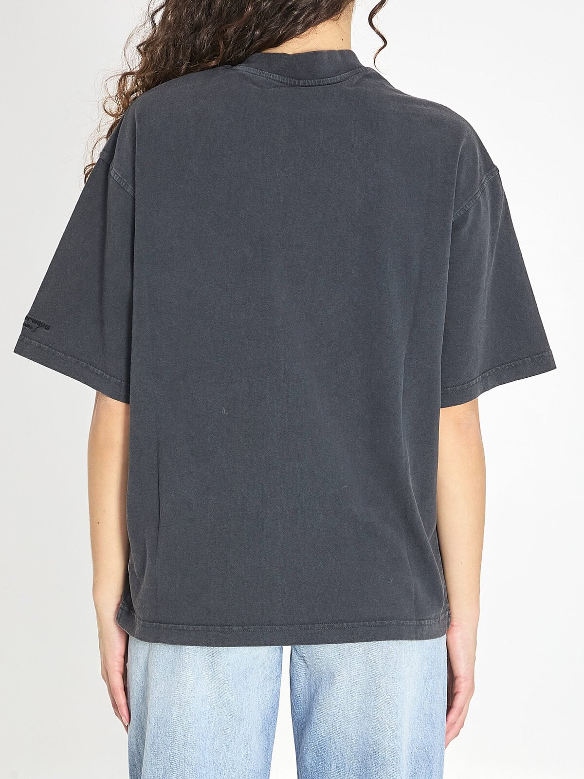 Black washed breathable cotton jersey t-shirt. It features a ribbed crew neckline, a lighter graphic with rhinestones at the center of the chest, short sleeves, and ribbed finishes. Oversized fit.