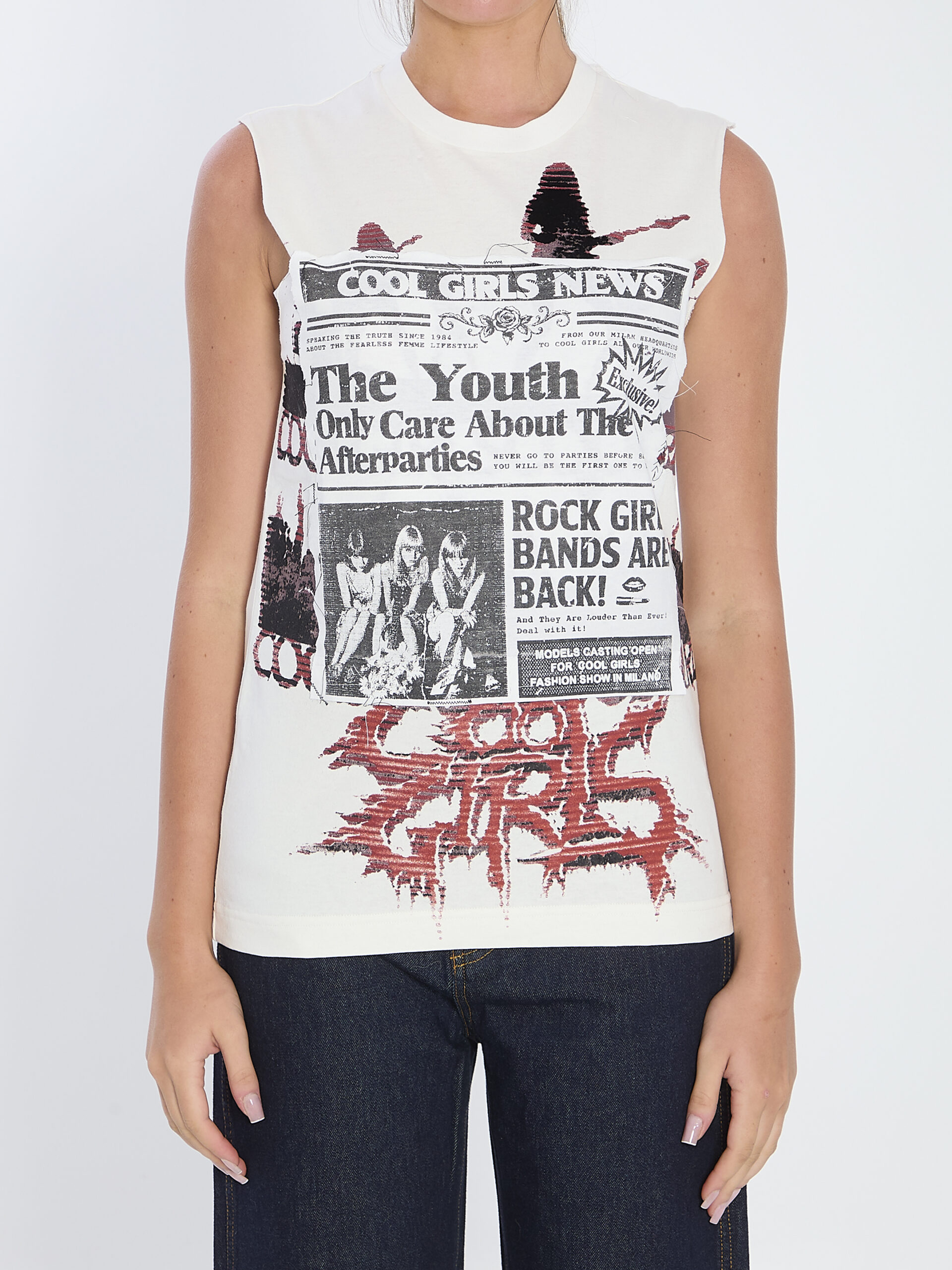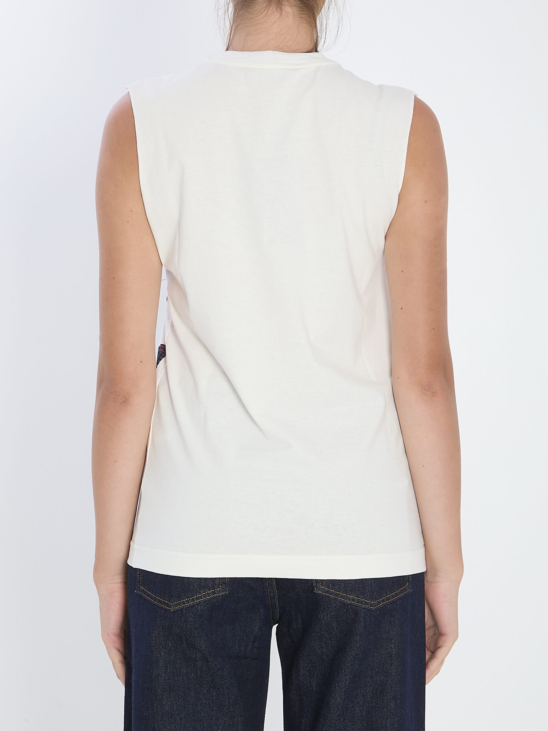 White cotton jersey sleeveless top. Features a crew neckline and a front print. Slightly oversized fit.