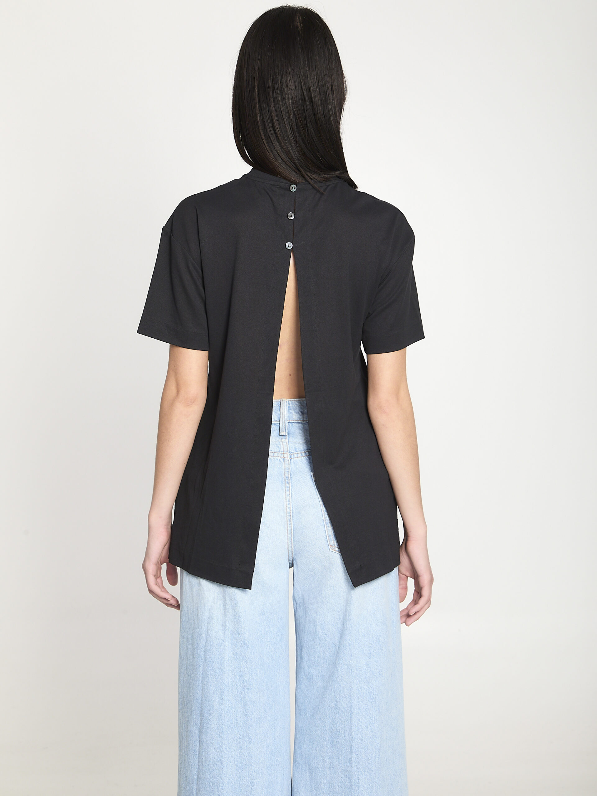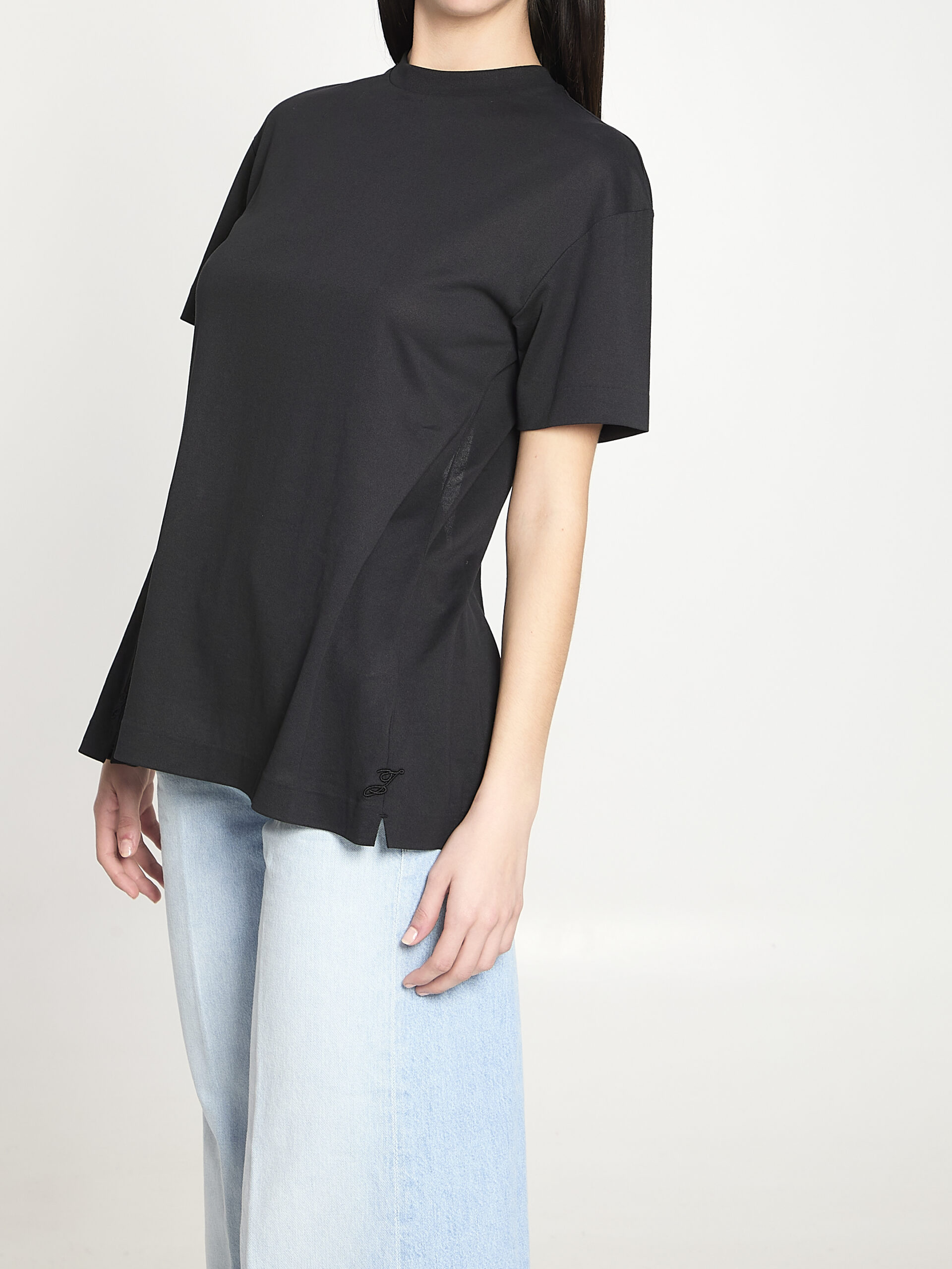 Black paper-effect jersey t-shirt. Features a ribbed crewneck, short sleeves, side slits with an embroidered J on each side, three-button closure on the back, partially exposed back with draped panels on each side, straight cut. Regular fit.