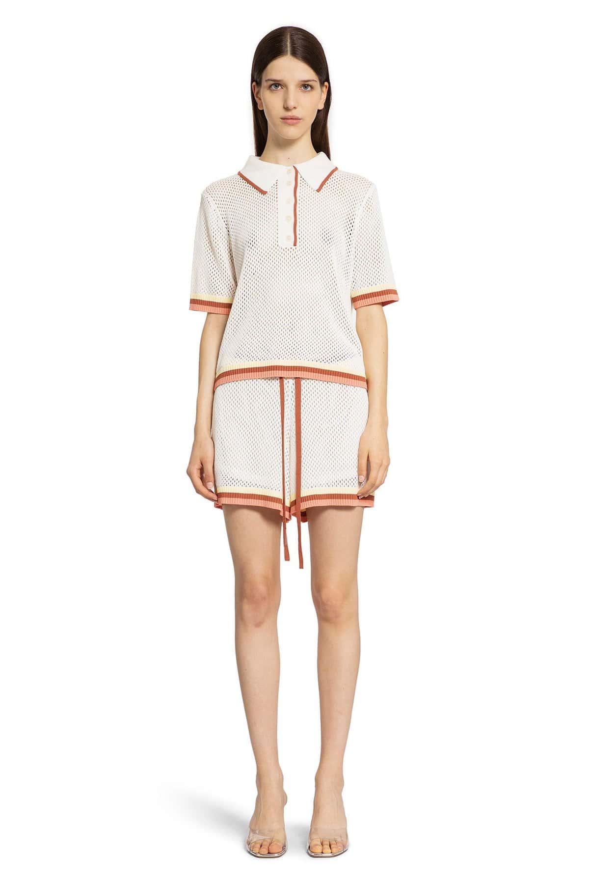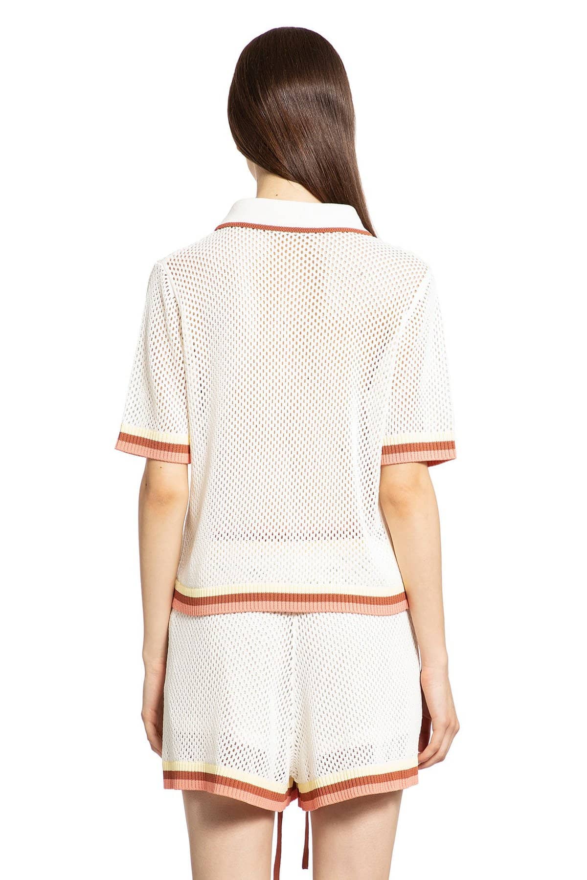 Multicolor White/brown/pink Open crochet knit Collar Quarter-button closure Short sleeves Tipped cuffs Striped ribbed hem and cuffs