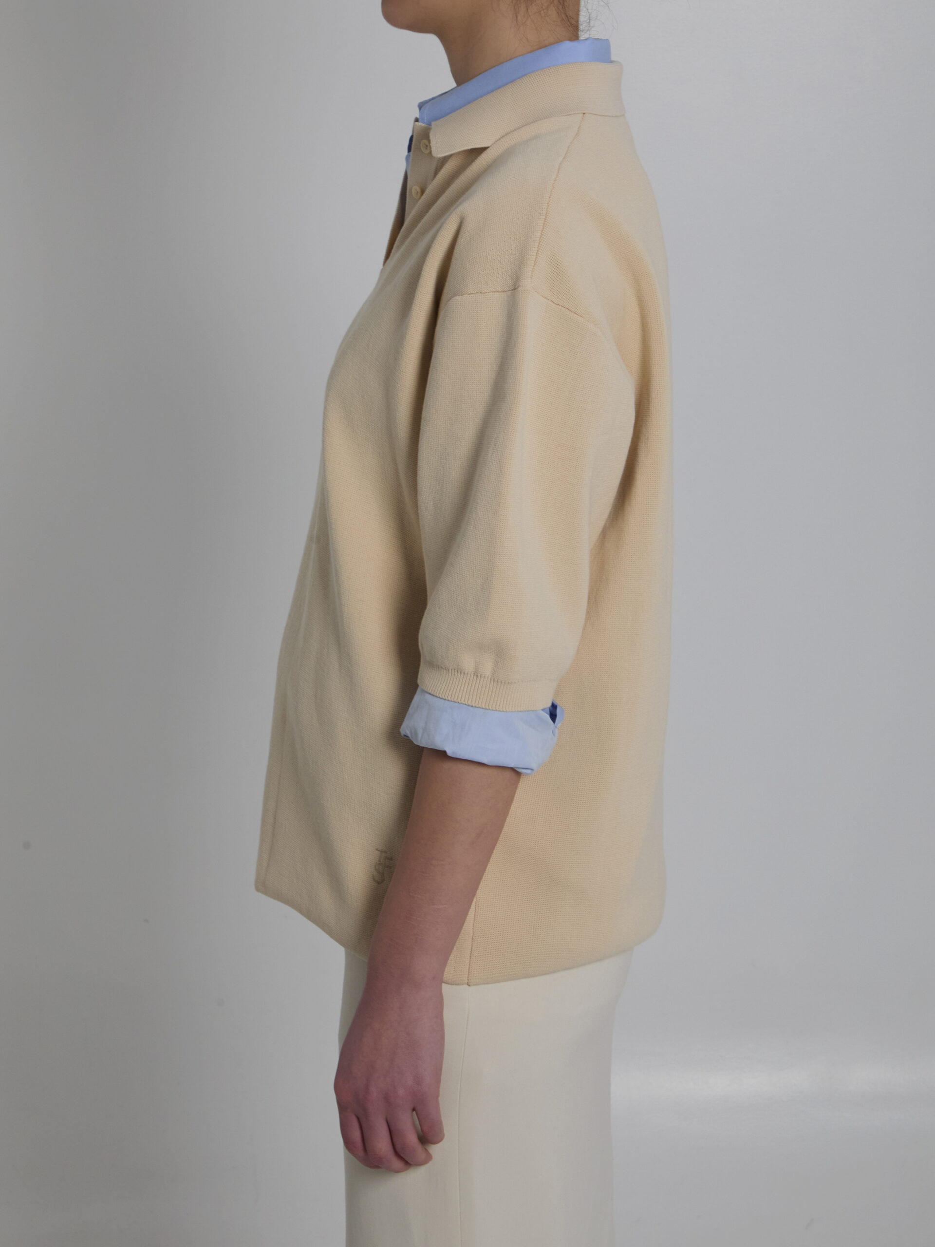 Cream cotton knit polo shirt. Features pointed collar, three-button front closure, short puff sleeves, tone-on-tone TFS embroidery at hem, ribbed trims. Regular fit.