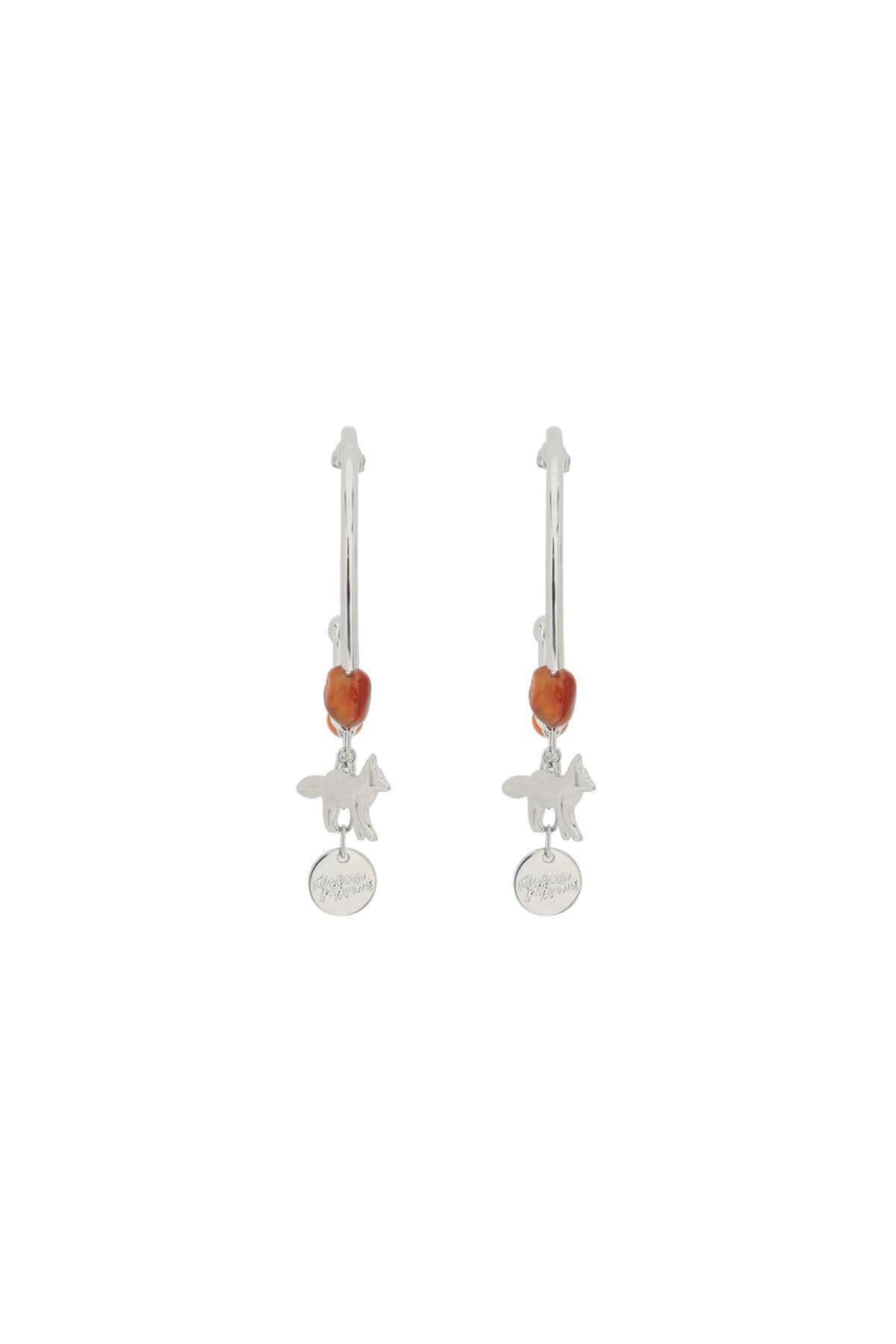 These Maison Kitsun hoop earrings are made of copper and adorned with pearls, a Fox charm, and a logo pendant. They feature a butterfly clasp for pierced ears.