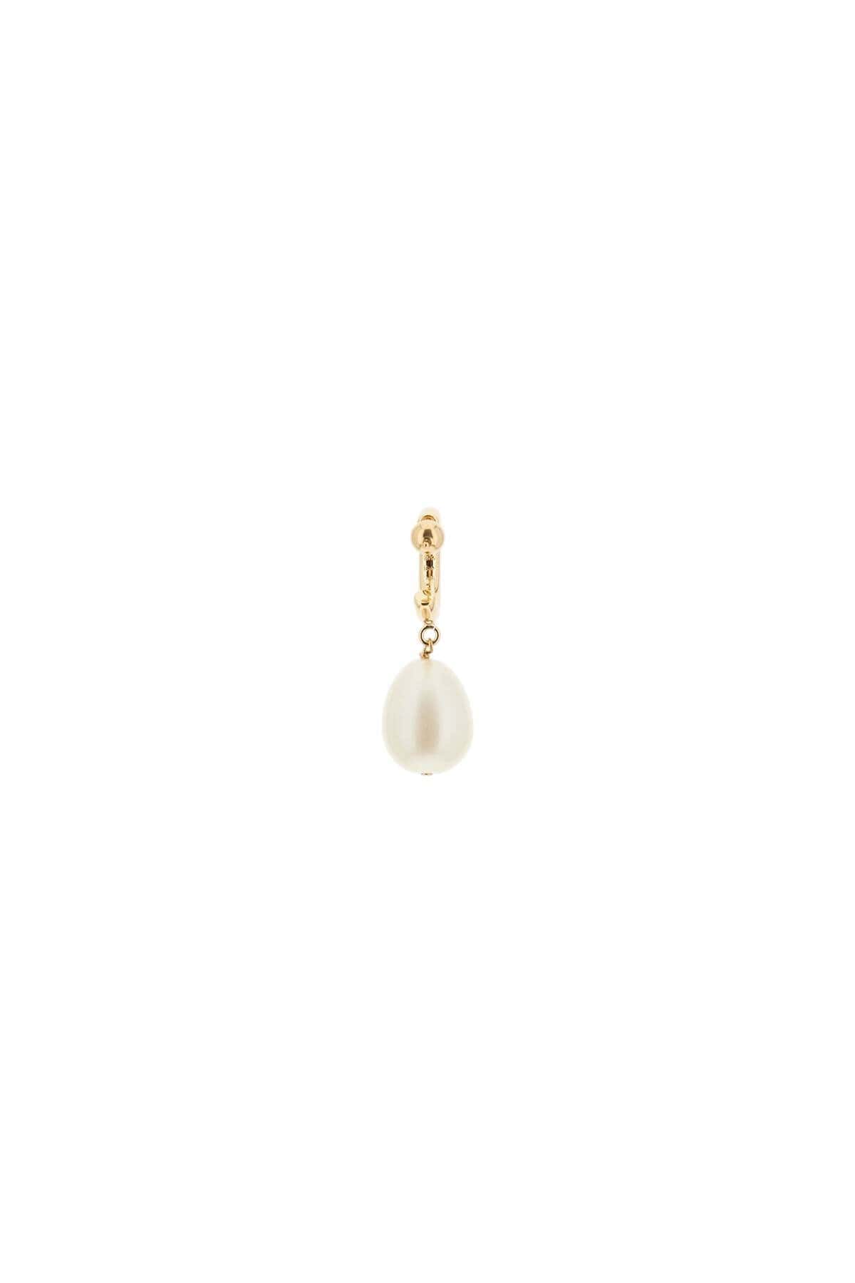 Saf Safu single hoop earring in 24k gold pleated brass, enriched by a faux pearl charm with a Swarovski crystal heart and printed detailing. Post back fastening, for pierced ear.